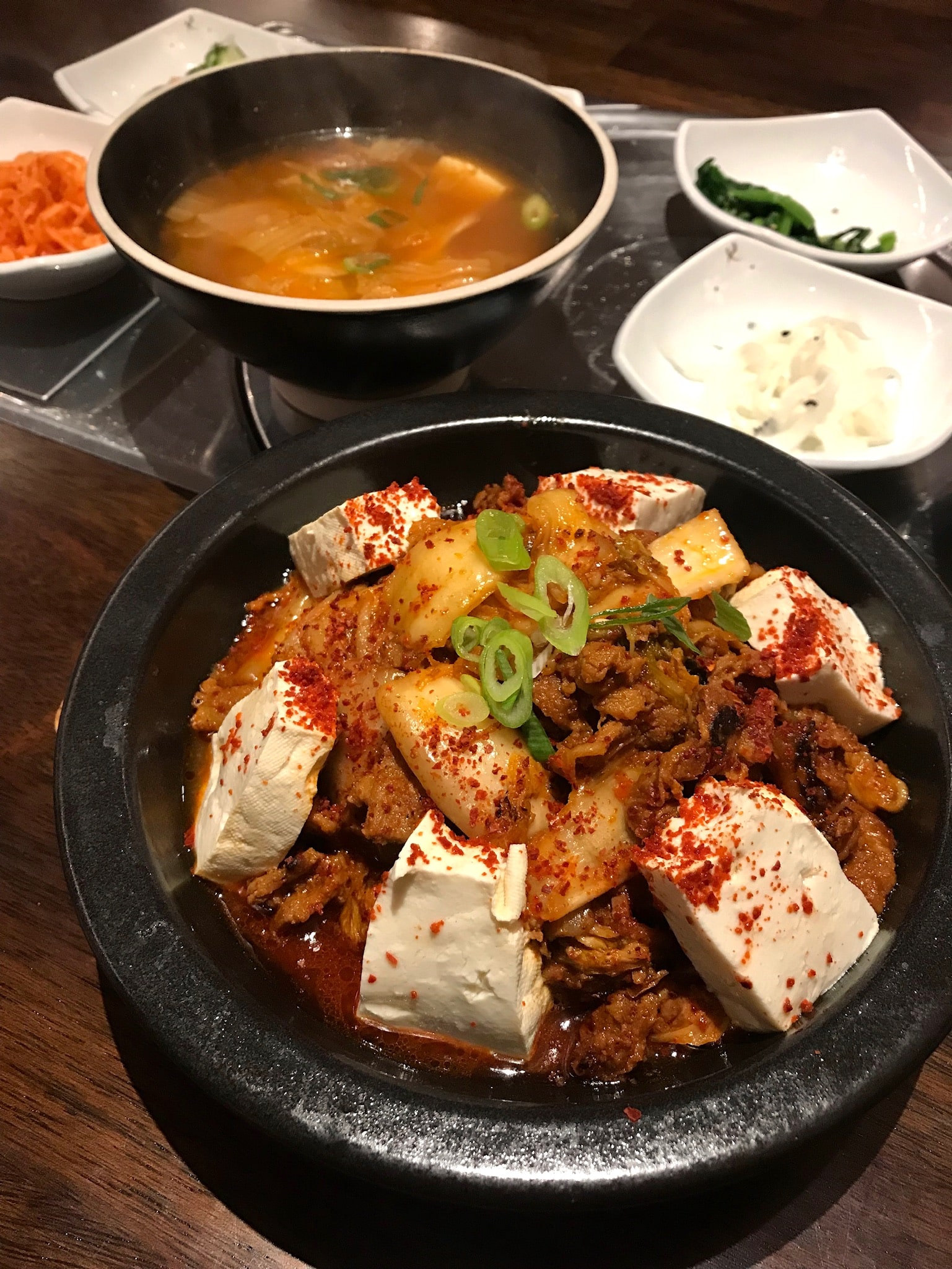 김치두부삼겹볶음: 이름이 정확히 기억은 안 난다. 아마 김치삼겹볶음인가? 이거는 진짜 한미 갈 때마다 시켰고 맛없다는 사람을 본 적이 없다. 위에 올라가는 두부도 너무 부드럽고 양이 너무 많아서 밥 두 공기는 먹어야한다. 자극적인 제육볶음 맛인데 밥이랑 먹기 딱 좋다. 김치삼겹볶음 위에 있는 건 김치국이었나..이 날 에피타이저로 시켰던 거 같은데 딱히.. 다시 먹을 의향은 없다.