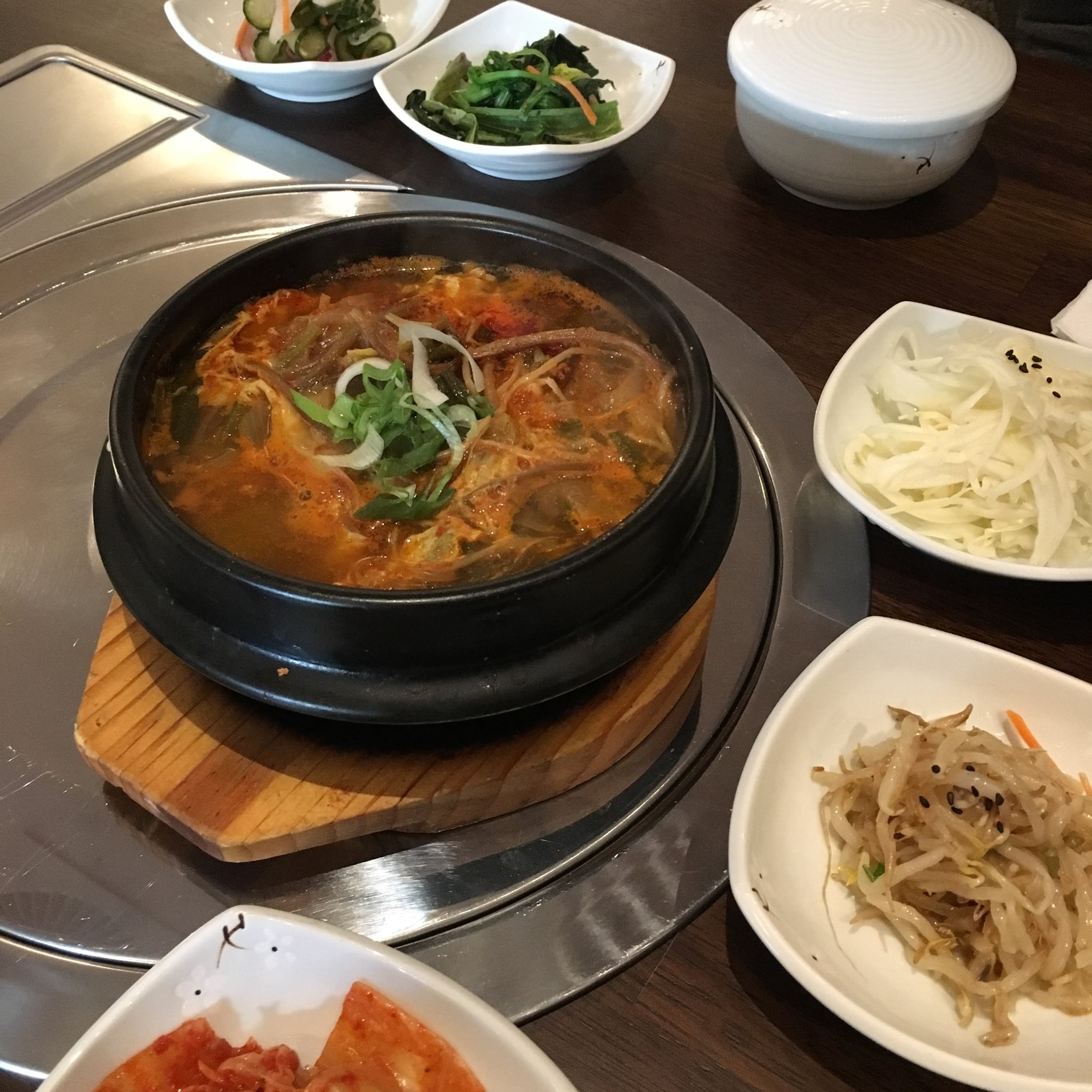 새우, 오징어, 생선, 홍합 등등이 들어있는 해물탕이 나왔다. 국물을 먹고 나서 먹던걸 시킬 걸 하고 후회했다..김치삼겹볶음을 시킬걸 왜 해물탕을 시켰을까.. 친구들이 시킨 육개장도 소불고기도 맛있어 보였는데 해물탕은 그저 그랬다. 자극적인 맛을 좋아해서 그런지 심심한 맛의 해물탕이 내 취향은 아니었다. 다음엔 육개장이나 김삼볶을 시켜야지. 같이 나온 반찬들이 맛있어서 거의 반찬이랑 한 공기 다 먹은 듯하다. 한미는 반찬이랑 밥을 한 번씩 리필해준대서 반찬도 밥도 한 번 더 받았다.