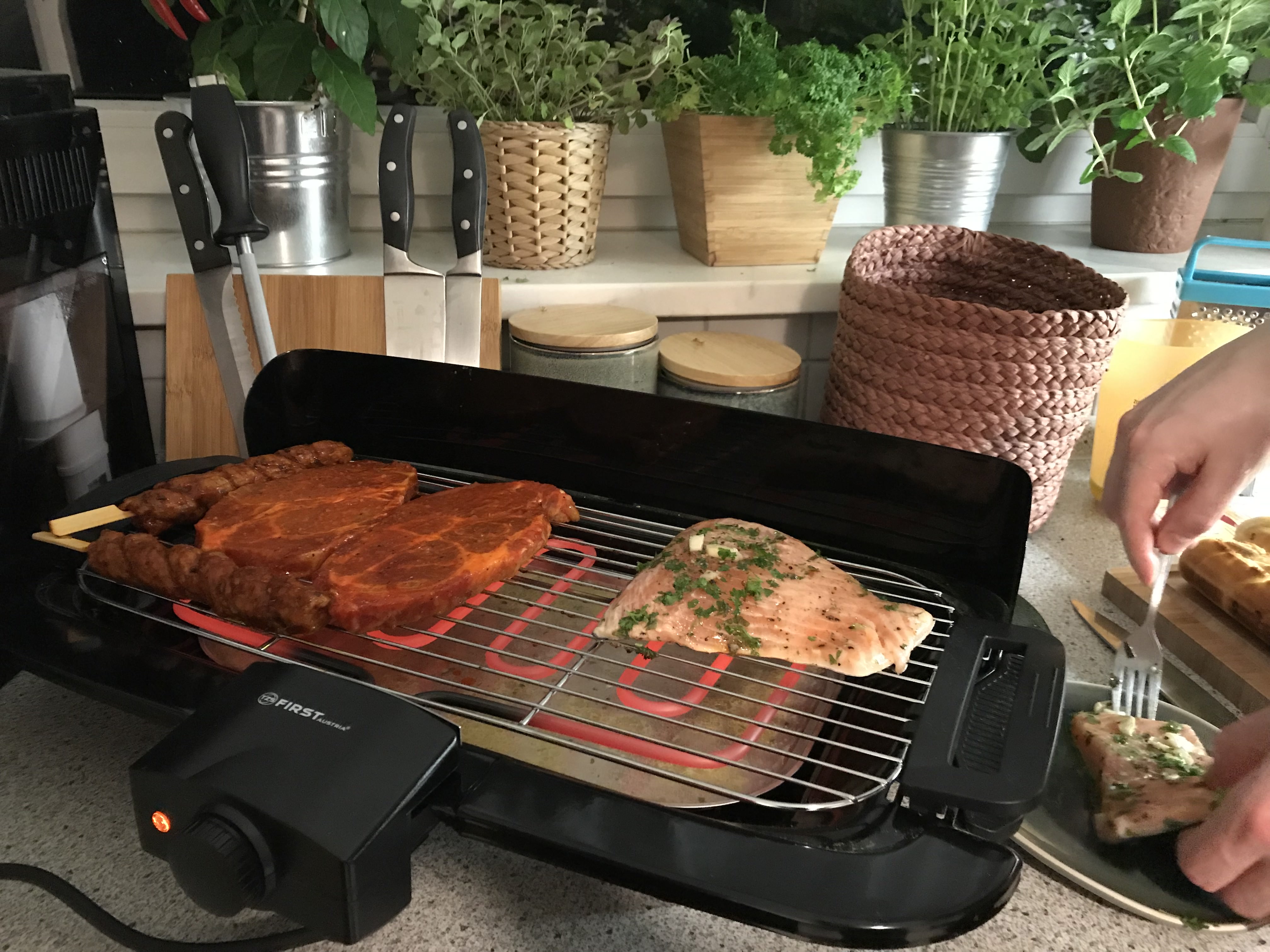발코니가 있는 집에 이사 온 뒤로 바베큐를 하려고 전기 그릴도 사고 날씨가 좋아지길 만을 손꼽아 기다렸다. 그러다 친구가 한국에서 놀러 오기도 했고 전기그릴도 써볼 겸 드디어 바베큐를 하기로 결정! 바베큐 하기 하루 전 Arne와 나는 고기를 샀고 채식주의자인 친구를 위해서는 연어를 준비했다. 드디어 당일 저녁이 되었는데 전날만 해도 날씨가 정말 좋아서 완전 바베큐 날씨였으나 급격하게 흐려지고 비가 오는 날씨 때문에 어떻게 할까 하다가 그냥 주방에서 할까? 하고 주방에서 시도를 하게 되었다. 연기가 날까 걱정했는데 전기그릴을 쓰니 연기가 하나도 안 나서 신기했다.
