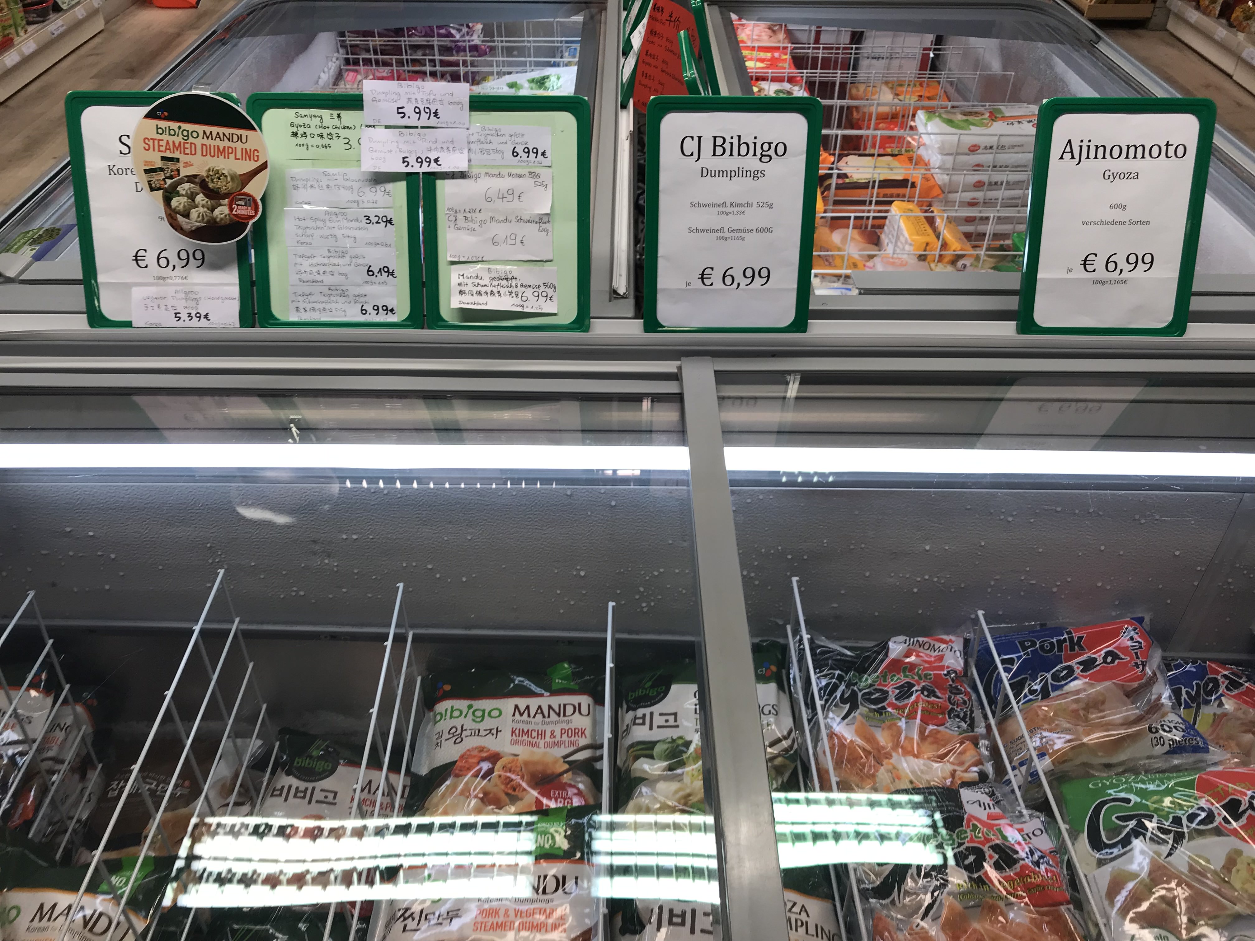 다양한 종류의 비비고 만두도 있다. 우리집 근처 아시아마트에서는 거의 4 유로대에 팔았던 것 같은데 조금 비싼거 같긴하다.