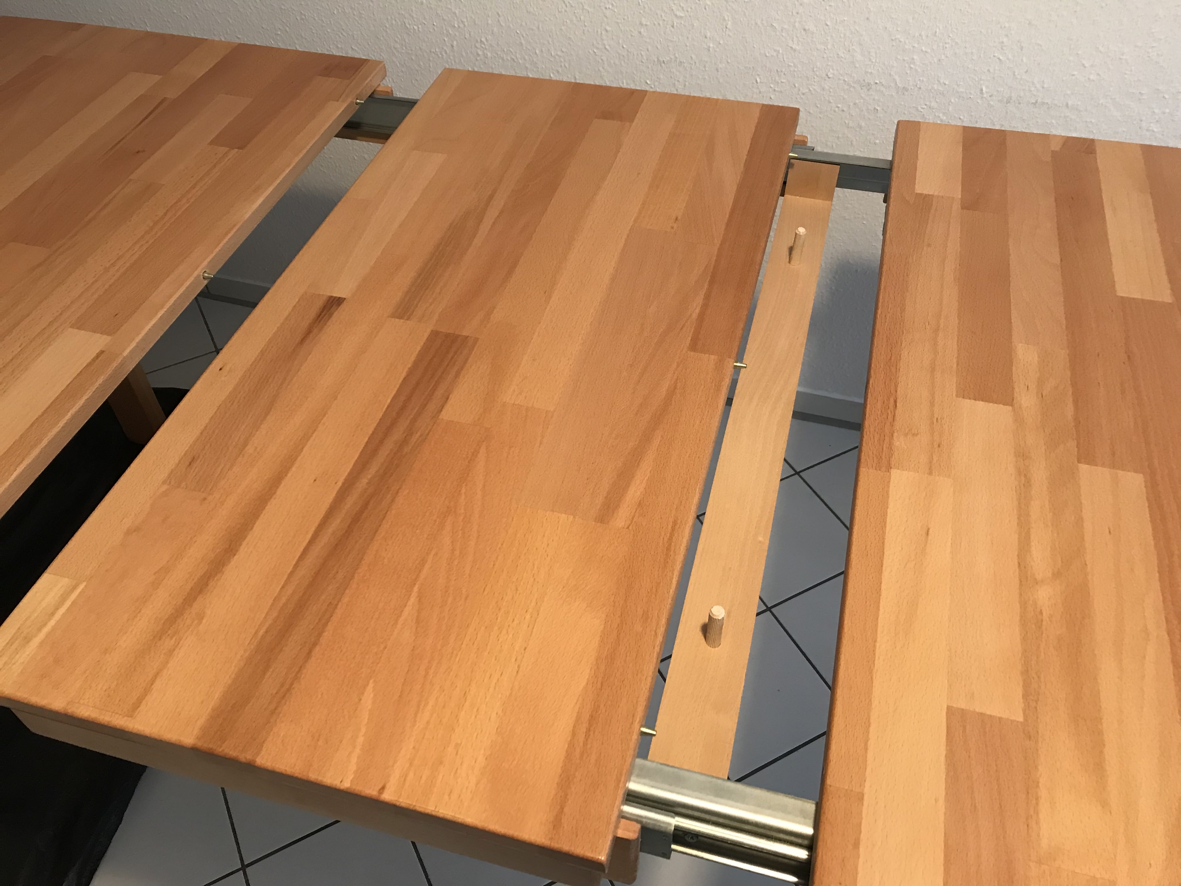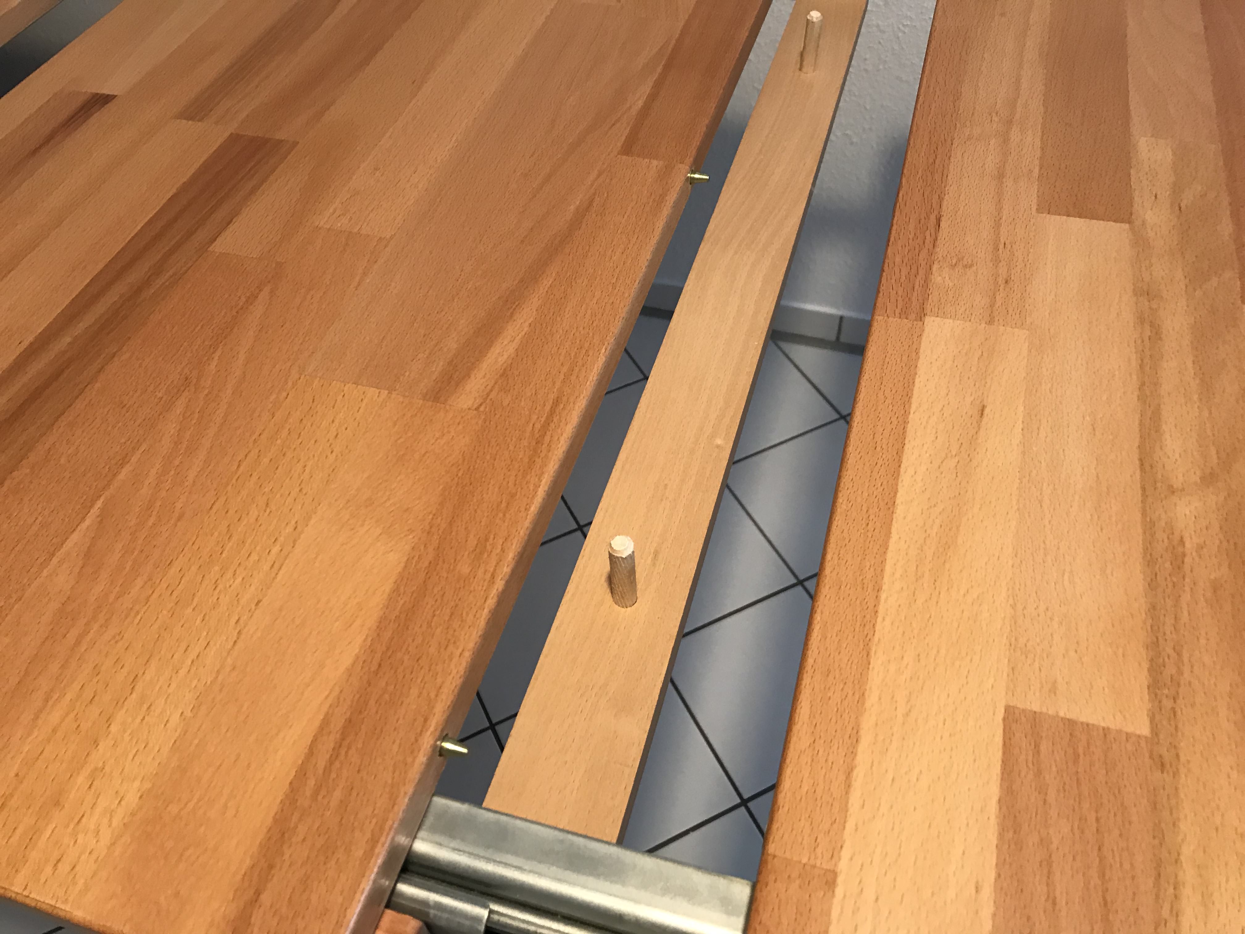 1차로 발라줬는데 벌써 차이가 났다. 가운데 있는 나무 조각이 바르지 않은 것이고 양쪽에 있는 식탁이 Holzsiegel이 발려진 것이다.