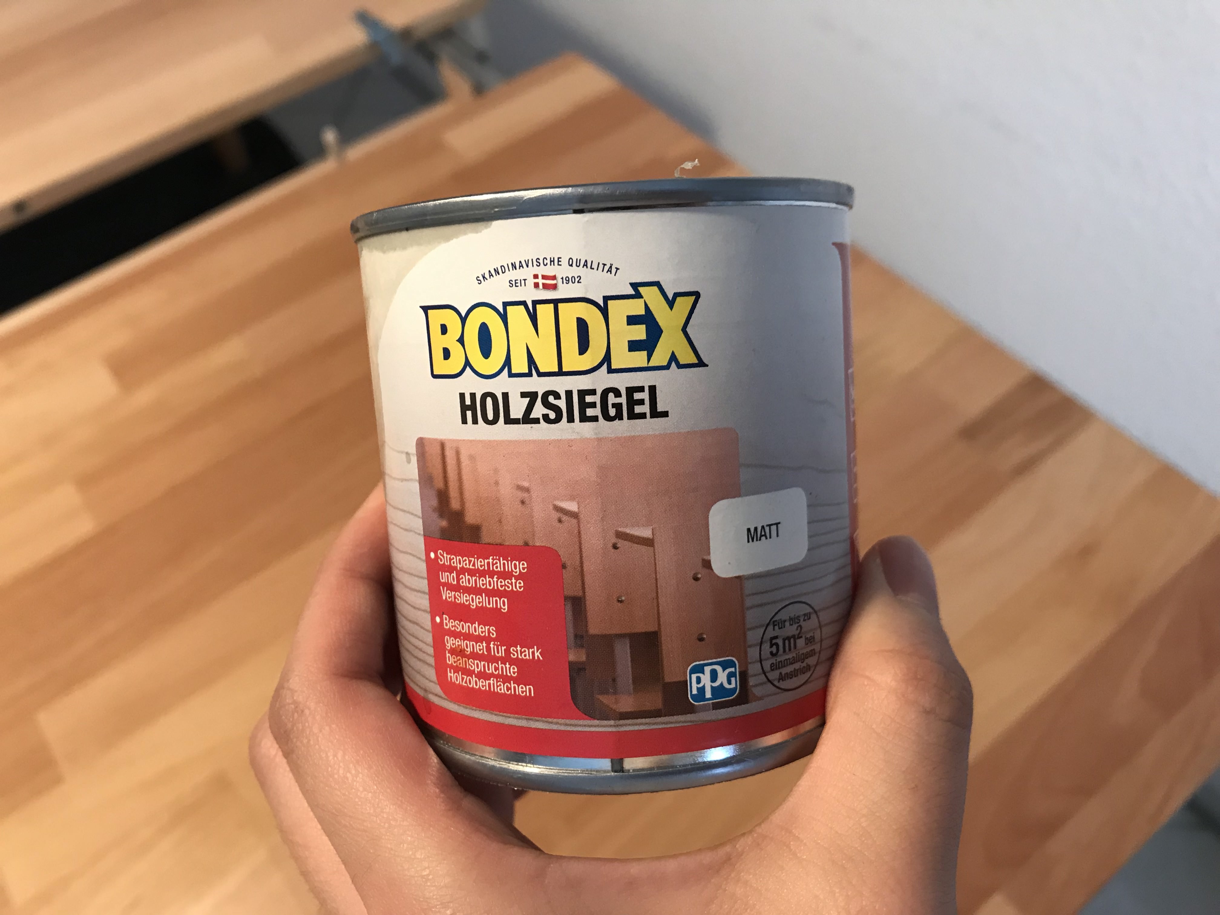 Holzsiegel이라고 적혀있고 영어로는 Wood Sealer라고 한다. 사실 리폼해본 적도 없고 나무 관련은 잘 몰라서 Varnish랑 비슷하겠지 하고 그냥 샀다. 무광도 있고 유광도 있는데 우리는 무광을 선택했다. 무광이라고 하긴 하지만 다 발라보니 완전 무광은 아니고 그래서 좀 빛을 받으면 빛나긴 한다.