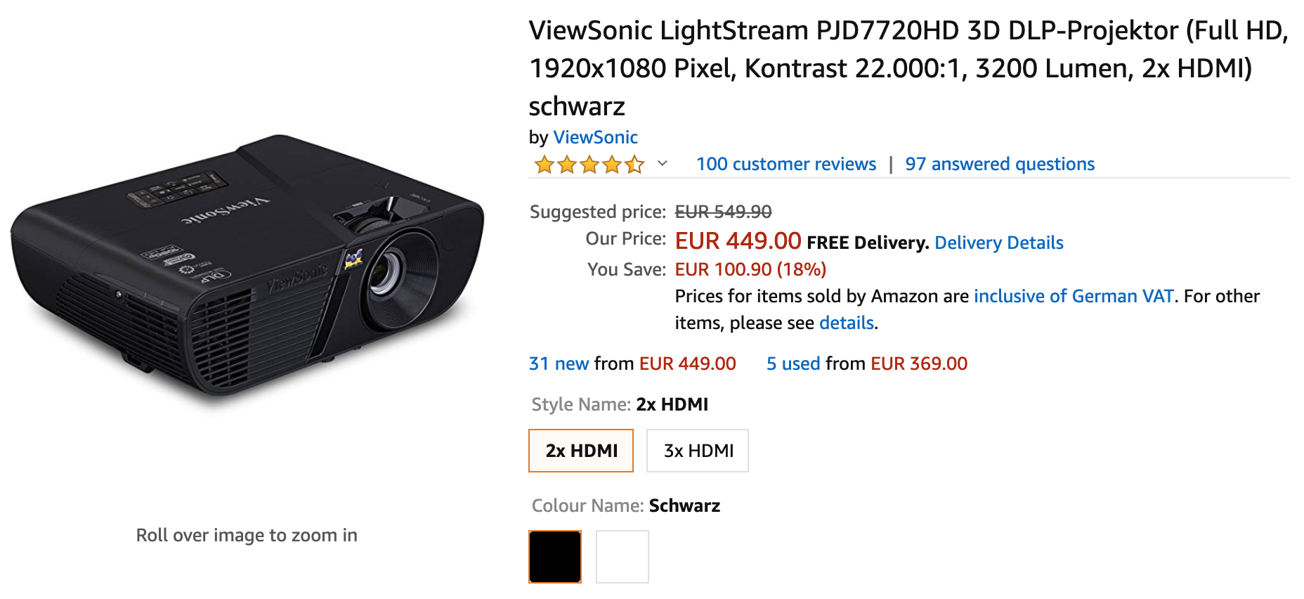 거실에 티비가 있긴 하지만 독일어라 내가 아예 안 보기도 하고 우리는 거의 넷플릭스를 봐서 빔프로젝터를 항상 가지고 싶어 했다. 새 집으로 오면서 거실에 공간도 더 넓어지고 Arne가 친구 집에서 빔프로젝터로 왕자의 게임을 보고 오더니 거실에 흰 벽도 있으니 사자!!! 해서 가정용 빔프로젝터로는 뭐가 좋은지 찾아봤다. 생각보다 엄청 많은 종류의 빔프로젝터들이 있었고 좋은 것들을 엄청나게 비쌌다. 그래서 우리는 최대 500유로까지 예산을 잡고 찾아보니 가정용으로 보기 괜찮은 빔프로젝터 몇 개를 찾을 수 있었다. 최종적으로 우리가 주문한 건 뷰소닉에서 나온 PJD7720HD 모델이다.