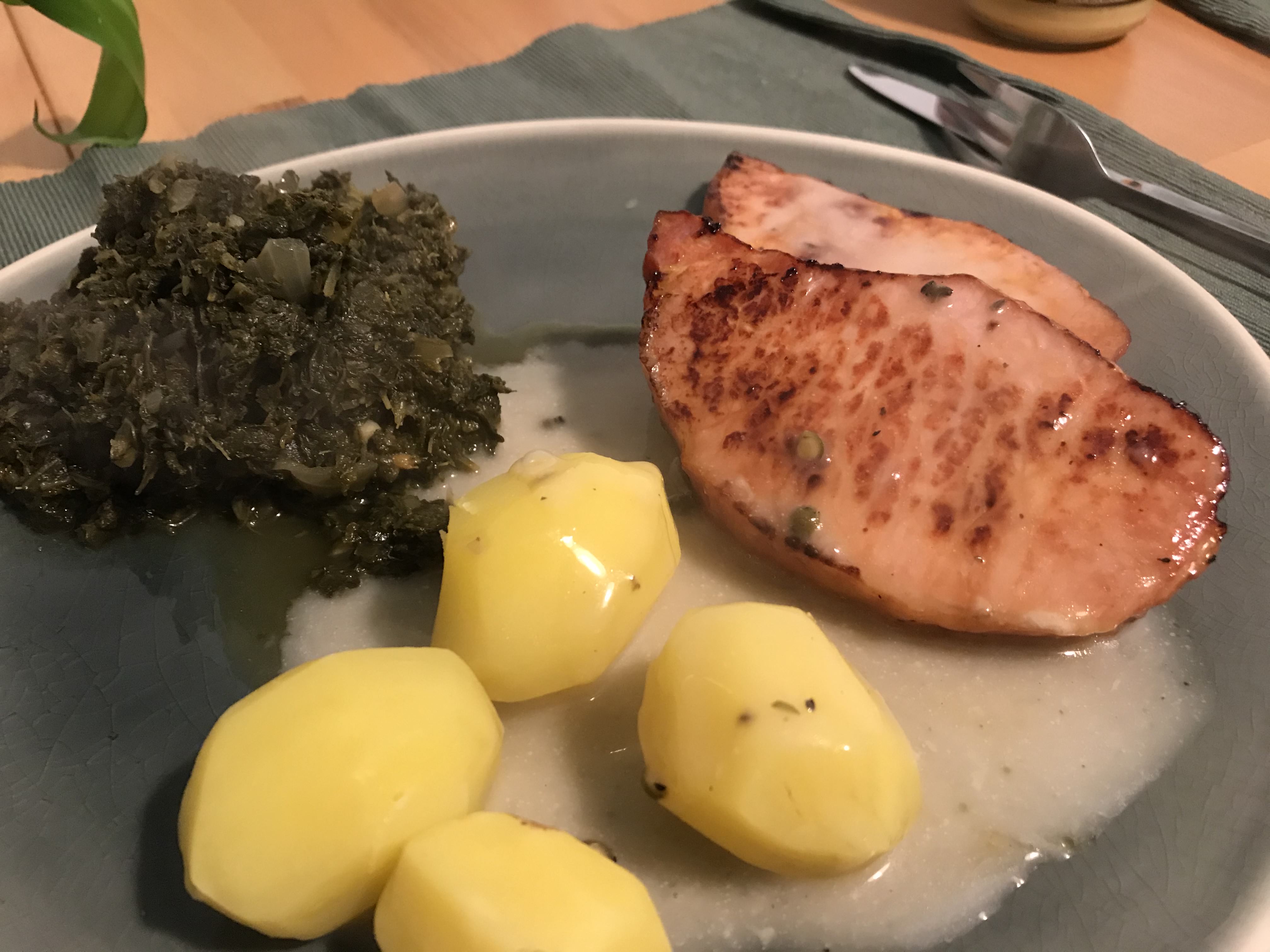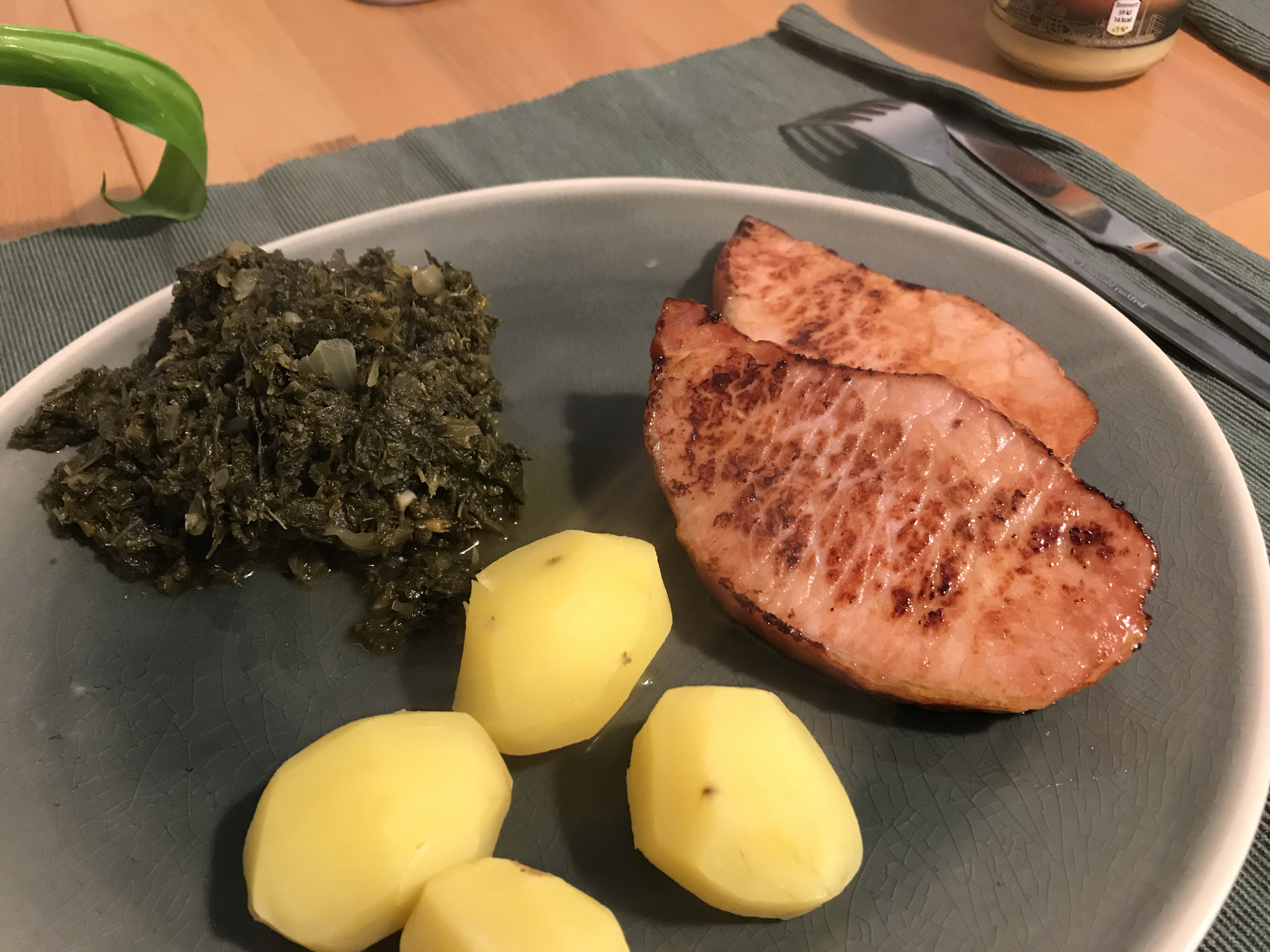 마트에서 산 Grünkohl에다가 양파랑 마늘을 더 넣어서 끓이고 감자도 따로 삶았다. Kasseler는 마트 정육점에서 사서 그냥 기름만 두루고 구우면 된다. Grünkohl은 Kasseler랑 먹기도 하고 사진처럼 소시지랑 먹기도 하는데 이번엔 Kasseler랑 먹었다. 개인적으론 둘 다 Grünkohl이랑 잘 어울리고 맛있는데 Arne는 소시지랑 더 잘 어울린다고 했다.