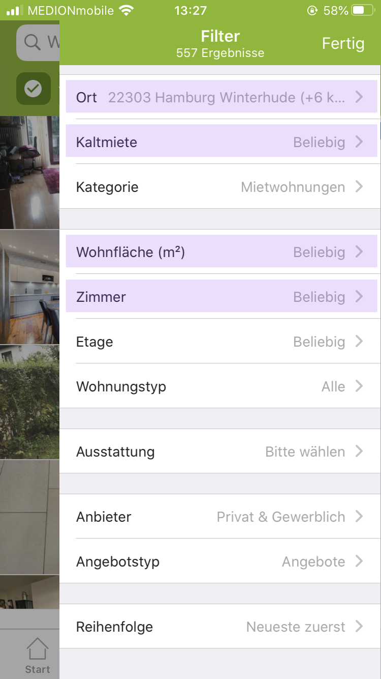 Mietwohnungen (월세) 카테고리에 들어가면 집 목록이 이렇게 뜬다. 너무 많은 집이 있으니까 필터 설정을 해주는 게 좋다. 상단에 체크 아이콘을 누르면 옆에서 디테일하게 설정할 수 있는 조건들이 나온다.