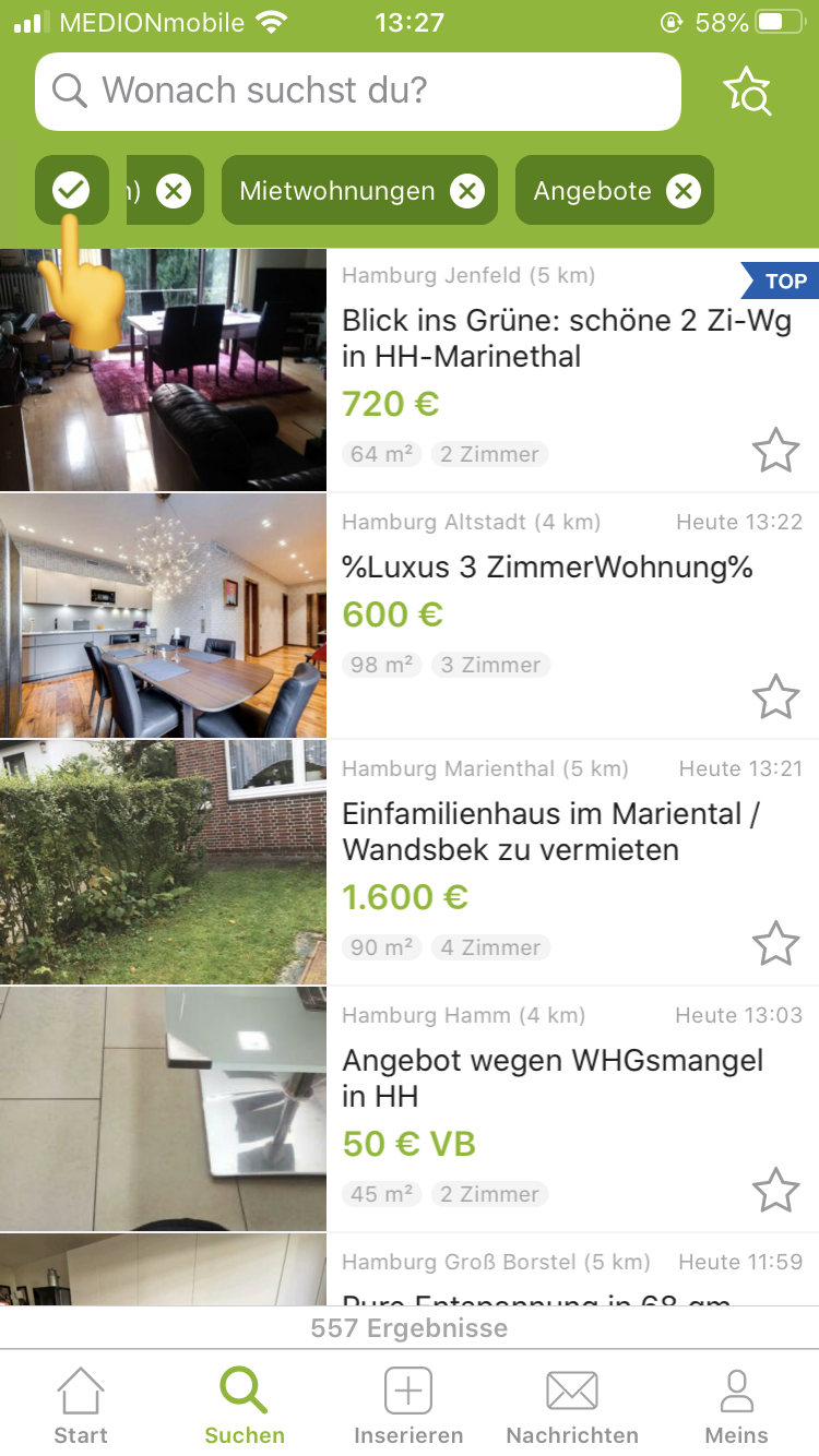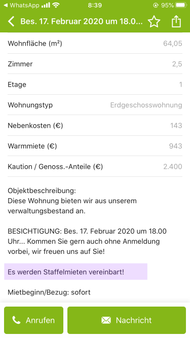 독일은 거실도 하나의 방으로 치기 때문에 방 2개면 화장실과 부엌을 제외하고 거실 1, 침실 1 이렇게 방이 2개인 집을 말한다. 마음에 드는 집을 발견했으면 클릭해서 들어가 보자.