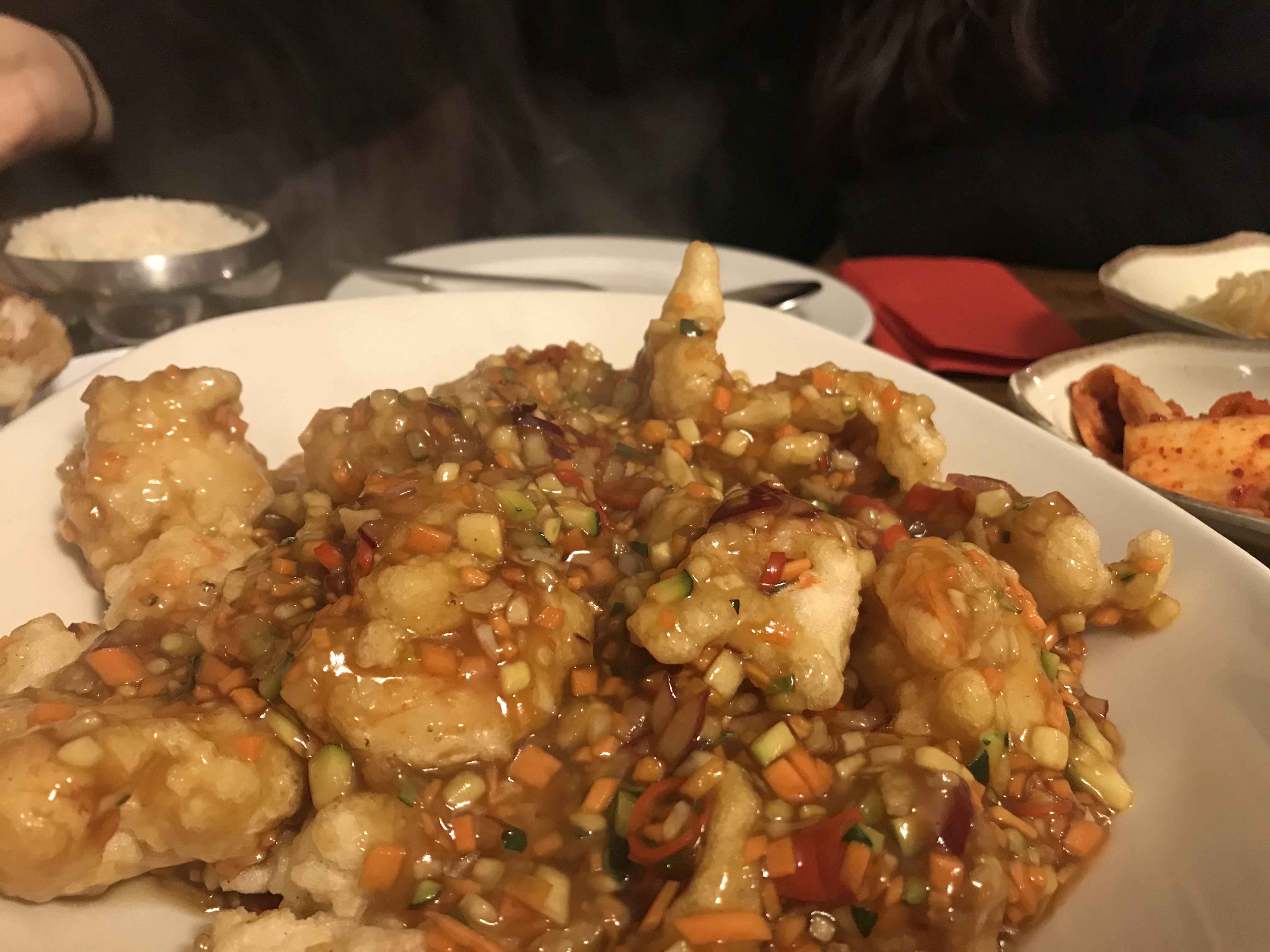 두 번째는 새우 깐풍기인가.. 탕수육이랑 소스는 비슷한데 내 입에는 탕수육보다 이게 더 맛있었다. 꿔바로우처럼 새우 겉은 쫀득쫀득하고 안에는 통통한 새우가 들어있다. 따뜻할 때 먹으면 진짜 맛있다.
