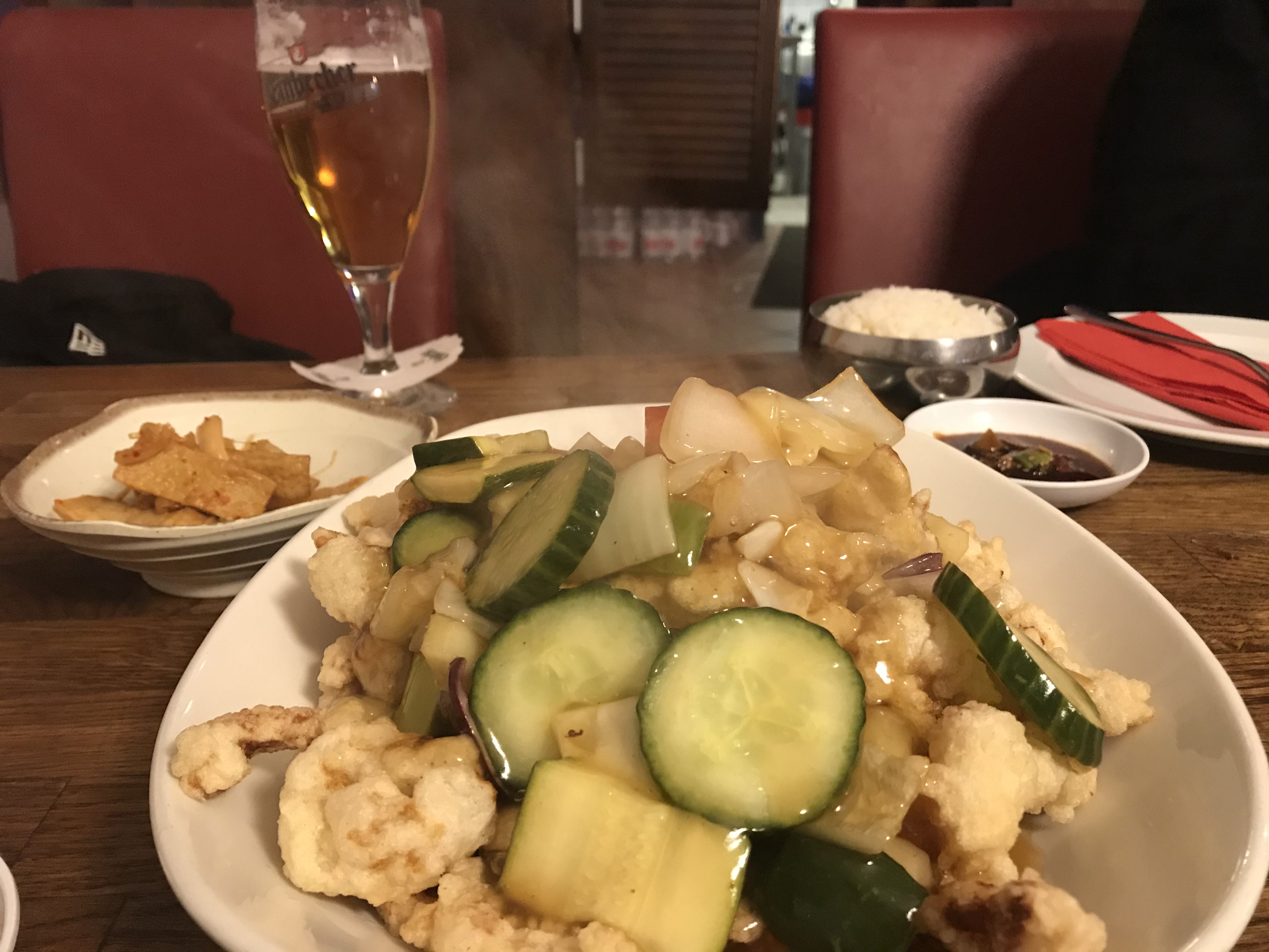 첫 번째 요리는 탕수육!! 가기 전부터 탕수육이 맛있다고 해서 가기 전에 탕수육을 먹기로 정해놨는데 막상 가보니 메뉴가 너무 많아서 정하기 어려웠다. 결국 서로 먹고 싶은 거 두 가지를 말해서 겹치는 거 세 개를 시켰다. 근데 그중에 하나가 탕수육이라 어쨌든 탕수육을 시켰다. 우리가 첫 손님이라서 그런지 음식은 꽤 빨리 나왔고 바삭하고 따끈한 탕수육은 한국에서 먹었던 거랑 똑같은 맛이었다. 양도 많고 먹기 전에 엄청 기대를 했음에도 불구하고 실망스럽지 않은 맛이었다.
