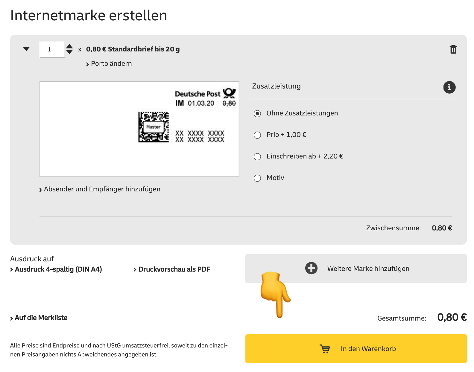나는 A4용지 한 장 넣었더니 10g이 나와서 Standardbrief로 선택했다. Standardbrief는 20g까지다. 우표는 Postkarte, 20g 초과 50g 이하 편지는 Kompaktbrief를 선택하면 된다.