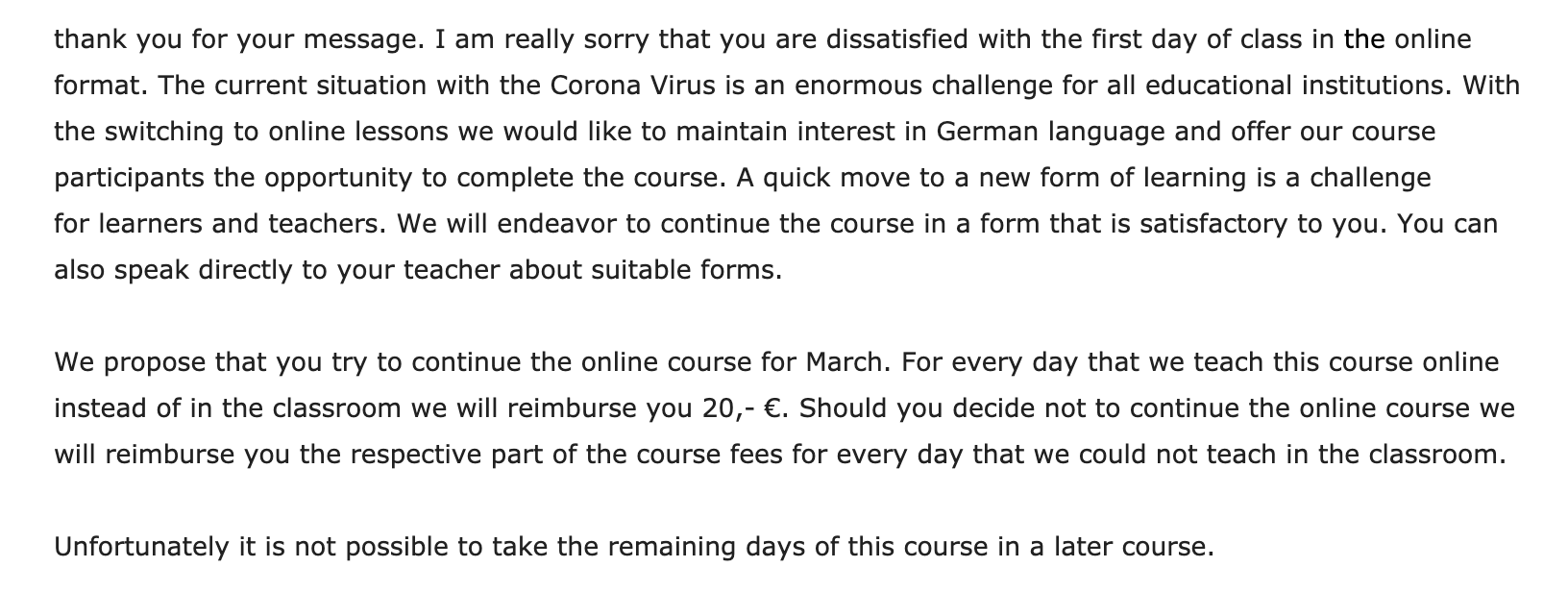 함부르크에 있는 지금 코로나바이러스 때문에 온라인으로 수업을 하고 있는 다른 어학원들은 어떻게 하고 있는지 그 학원에서 다음 코스는 언제 시작하는지 메일을 보냈다. Deutchakademie는 이미 다녀봤기 때문에 Germania-akademie, Colòn, Uns에 메일을 보냈고 Colòn 이 제일 빨리 답장을 보냈다.