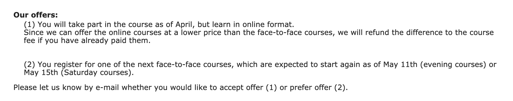 온라인으로 수업을 진행하는 데에 대해서 보상을 해주고 온라인 수업을 아예 원하지 않으면 이에 맞게 또 환불을 해준다고 한다. 어학원 중에 아예 온라인으로만 하고 환불도 안 해주는 어학원도 있다던데 이만하면 양반인가. 그리고 남아있는 날들을 다음 코스로 넘기는 건 안 된다고 했다.