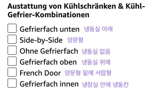 한국에선 한쪽은 냉장, 한쪽은 냉동인 양문형을 많이 쓴다. 하지만 딱히 반찬을 많이 두고 먹는 곳이 아닌 독일에선 아직까지 일반형 냉장고를 쓰는 집이 많다. 심지어 아예 냉동이 쪼끄맣게 들어있거나 냉장만 있는 냉장고도 있다. 독일에서 우리가 생각하는 일반적인 냉동, 냉장이 다 되는 냉장고를 사려면 Kühl-/Gefrierkombination라고 검색해야 한다. 우리도 양문형까지는 필요하지 않아서 냉장과 냉동이 있는 일반형을 살 건데 일반형 중에서도 배치가 냉장/냉동, 냉동/냉장 이렇게 두 종류가 있다.