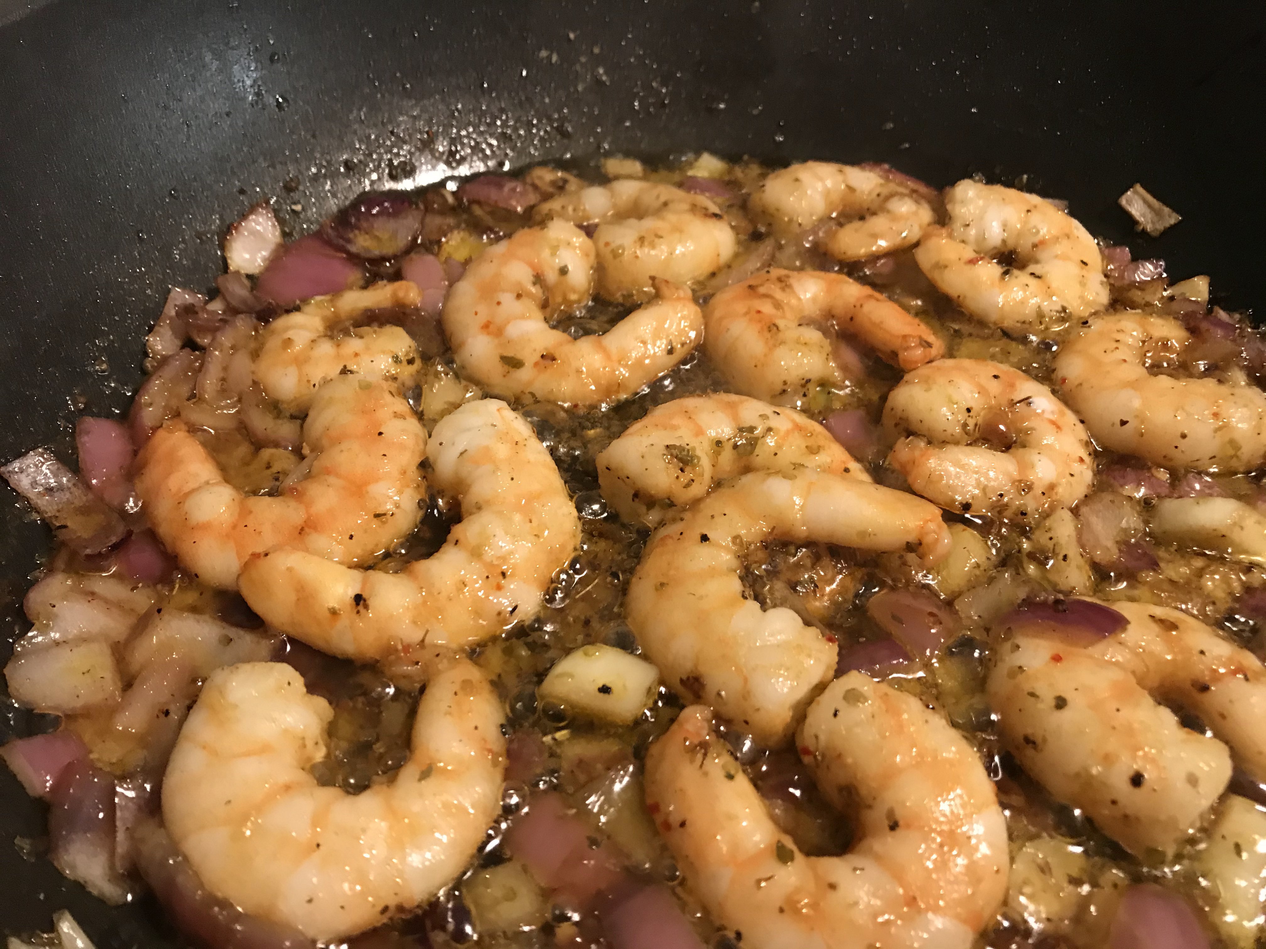 드디어 메인 요리 새우! 감바스 알 알히요(gambas al ajillo)를 만들어준다. 올리브오일을 잔뜩 넣고 마늘과 양파를 넣는다. 원래 양파를 넣는진 모르겠지만.. 우리는 양파를 좋아하니까 넣어준다. 마늘과 양파가 갈색으로 변하기 전 적당히 익으면 새우를 넣는다. 페퍼론치노, 소금, 후추를 넣고 간을 해주면 끝이다.