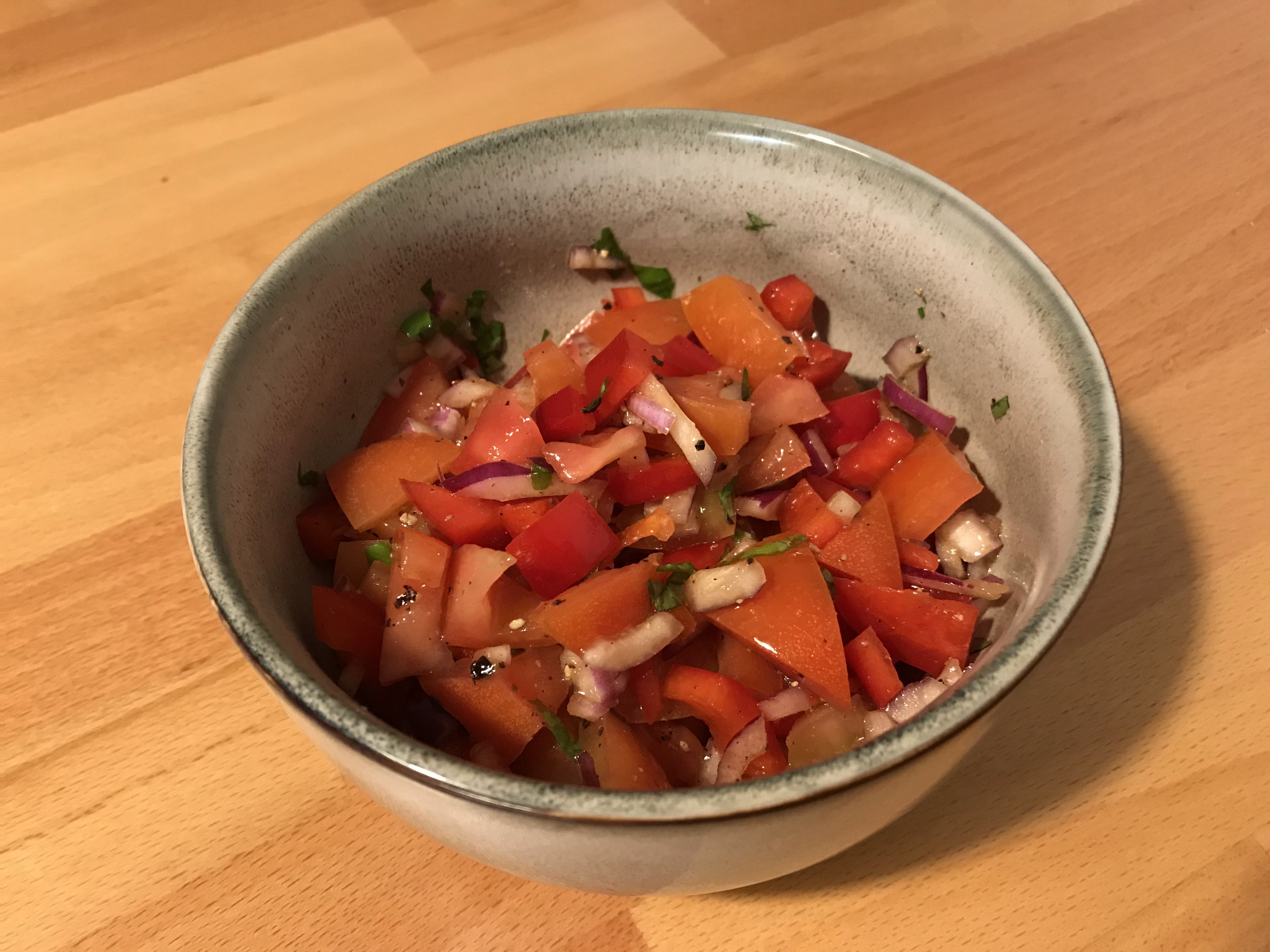 다음은 멕시칸 요리에 항상 나오는 피코 데 가요(Pico de gallo)를 만든다. 이전에도 살사를 한 번 만들긴 했지만 믹서기를 이용해 만든 살사는 내 스타일이 아니었다. 이렇게 큼직큼직하게 썰어 놓은 살사가 씹는 맛도 있고 재료의 맛들이 더 잘 느껴진다. 더 많이 만들고 싶었지만 토마토 남은 게 별로 없어서 많이 못 만들었다.