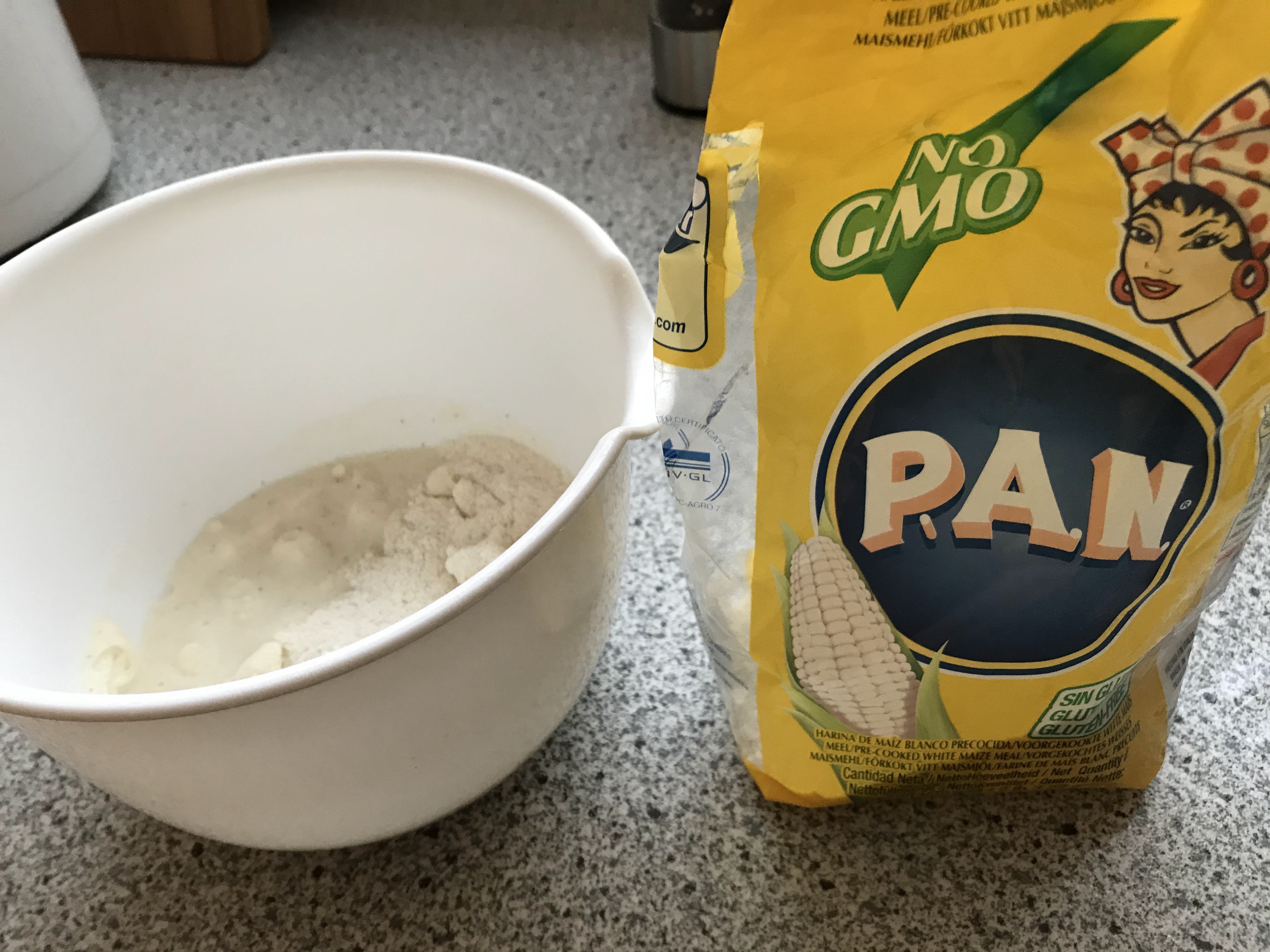 또띠아는 옥수수가루를 써서 만드는데 독일 마트에서는 찾아볼 수 없어서 아시아 마트에서 샀다. 옥수수가루를 살 때 주의할 점은 생옥수수로 만든 가루와 익힌 옥수수로 만든 가루가 있는데 익힌 옥수수로 만든 가루를 써야 한다. 비율은 2인분 기준으로 옥수수 가루 한 컵에 물은 한 컵 조금 안되게 넣었다.