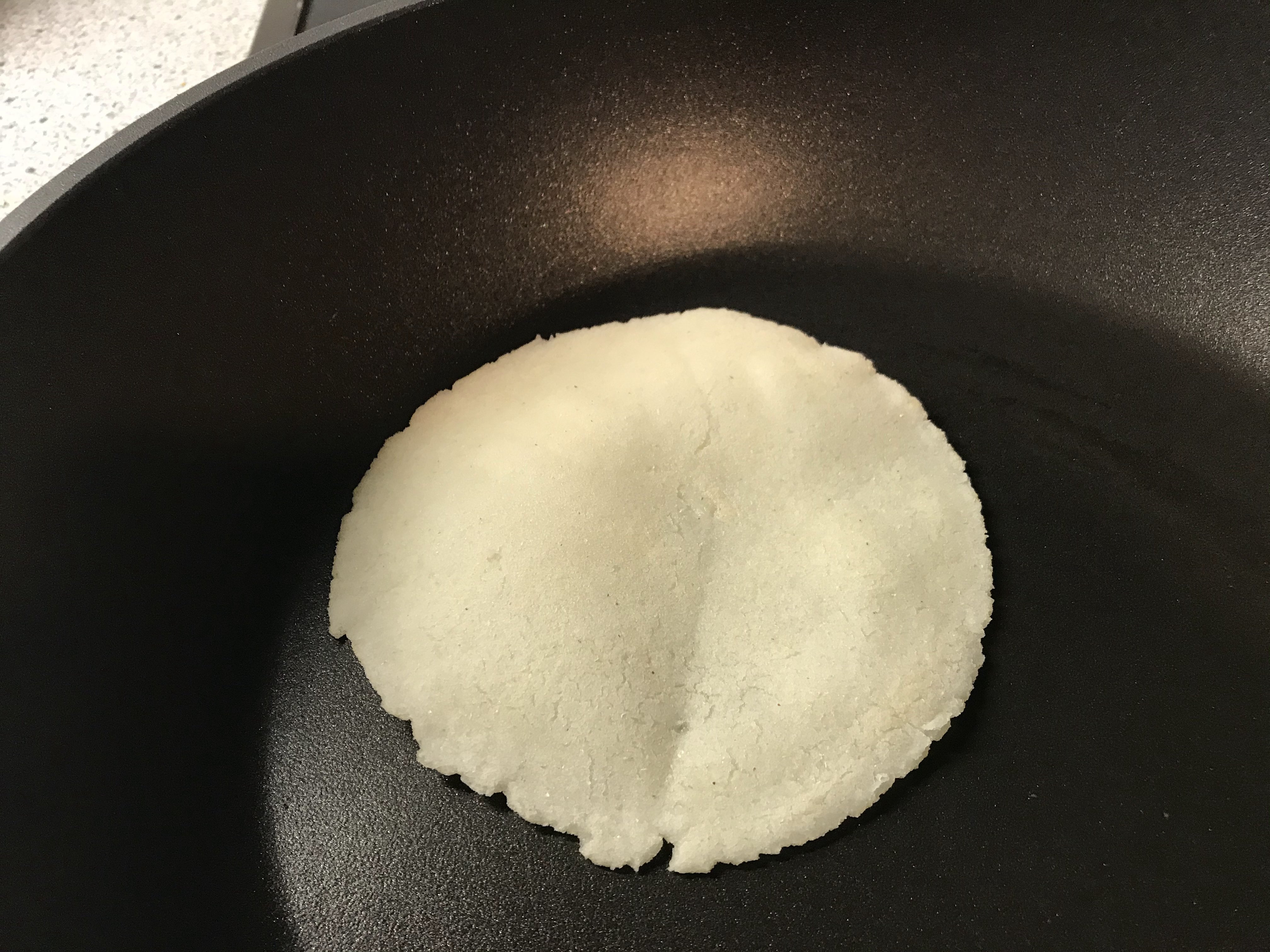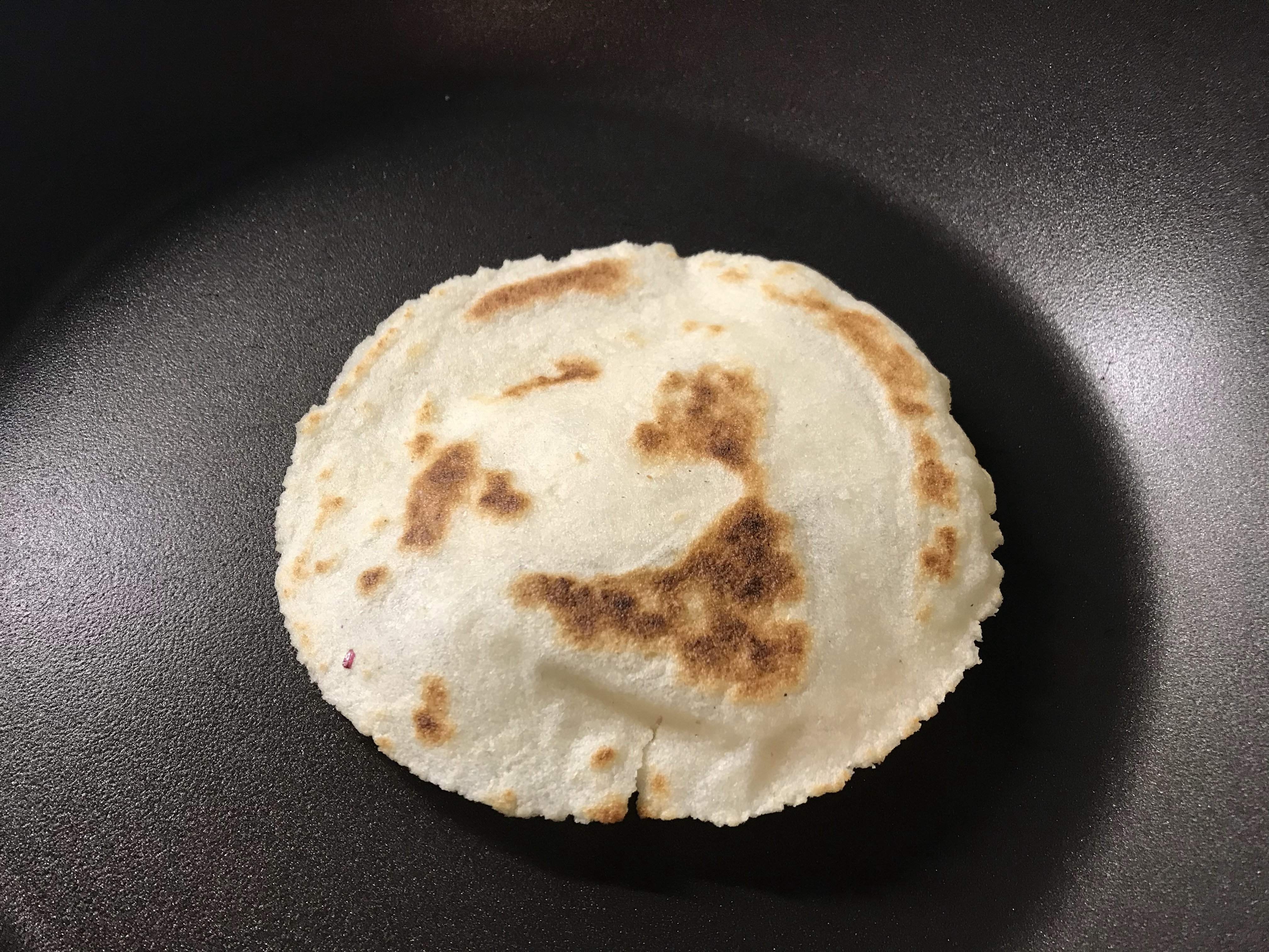 또띠아 프레스가 있으면 그걸 쓰면 된다. 하지만 없다면 우리처럼 지퍼팩을 잘라서 그 두 면에 사이에 또띠아 40g 정도를 넣고 냄비로 누른다. 그러면 또디아 프레스에서 누른 것 마냥 저런 모양이 나온다. 오일을 두르지 않은 팬에 한 쪽을 45초 동안 굽고 뒤집어서 또 45초 정도 굽는다. 처음엔 스탑워치로 재면서 했지만 이제 대충 가장자리를 보면서 1분 전후로 뒤집는다.
