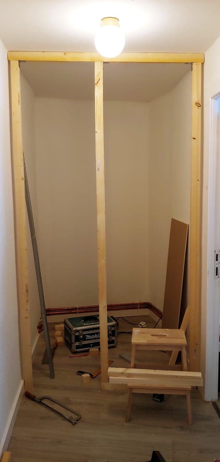 먼저 각재로 틀을 잡아준다. 기둥을 세우고 밑은 발에 걸리지 않게 문턱이 없도록 잘라준다. 왼쪽이 문이 될 예정이고 오른쪽은 벽이다.