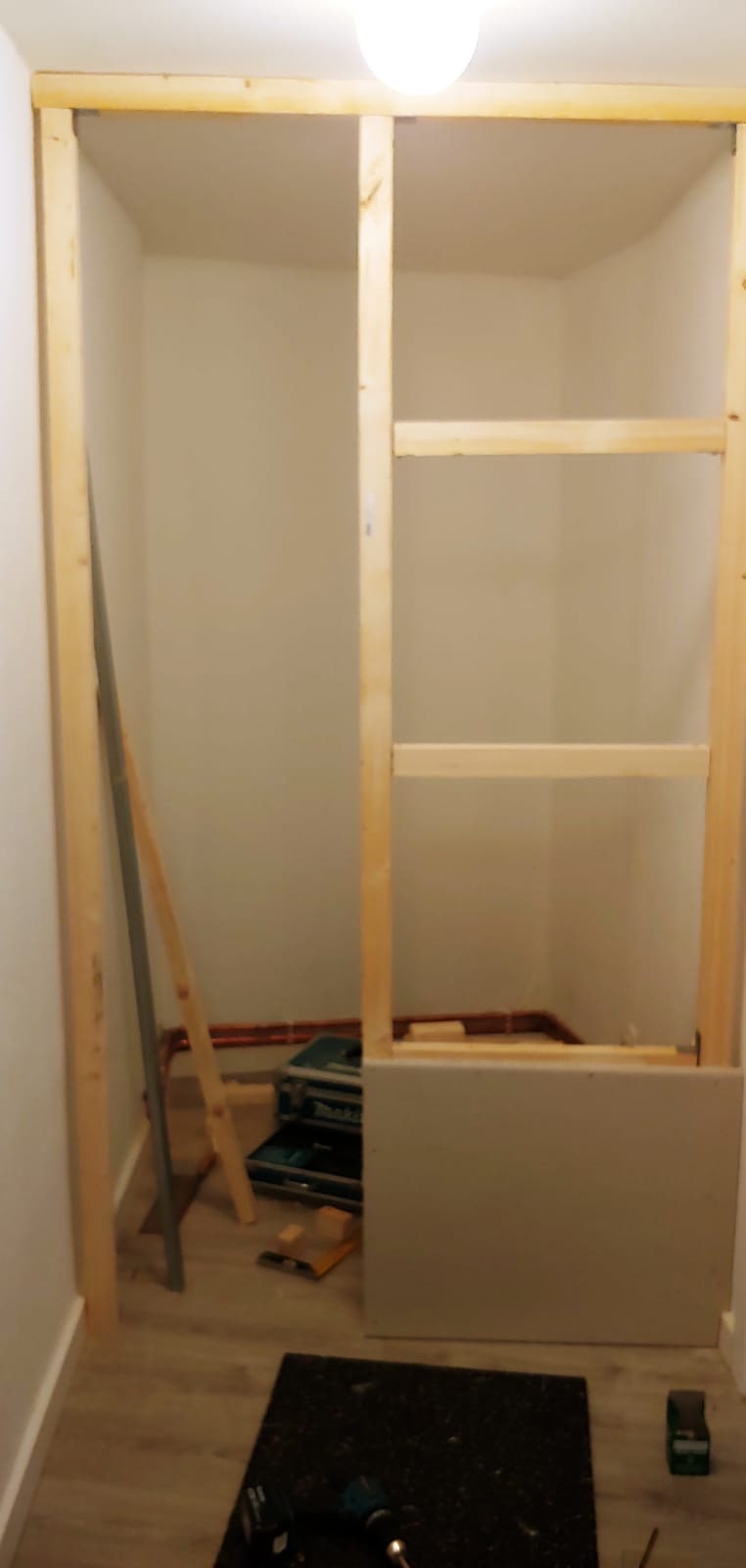 잡아둔 틀에 맞게 벽을 잘라서 붙이면 갑자기 완성(?) 작업하면서 Arne에게 틈틈이 사진을 찍어달라 했더니 내가 찍으라고 할 때만 찍어서 갑자기 완성이 되어버렸다. 왼쪽 사진에서 오른쪽 사진으로 가는 과정 중에 벽을 박는 것 외에도 틈새를 메우는 작업을 했다.