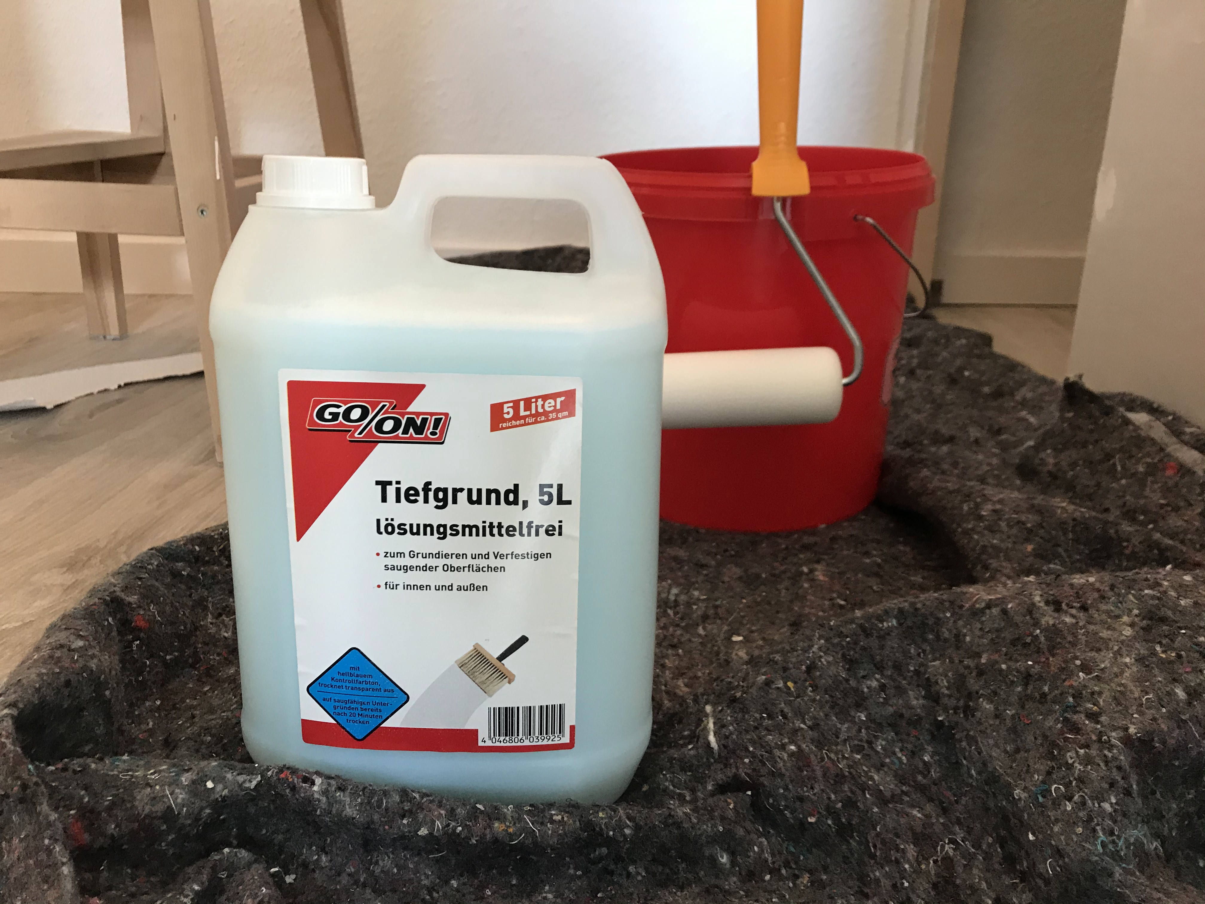 벽을 세웠으니 이제 벽 위에 다른 벽과 동일하게 벽지와 페인트를 발라야 한다. 하지만 그전에 해야 할 일이 있는데 사진에 보이는 저 액체를 벽에 미리 발라줘야 한다. 세운 벽을 손으로 만지면 먼지가 묻어 나온다. 이 먼지들이 벽지를 붙였을 때 접착력을 떨어뜨리니 이 액체를 바르고 말린 다음에 벽지를 붙여준다.
