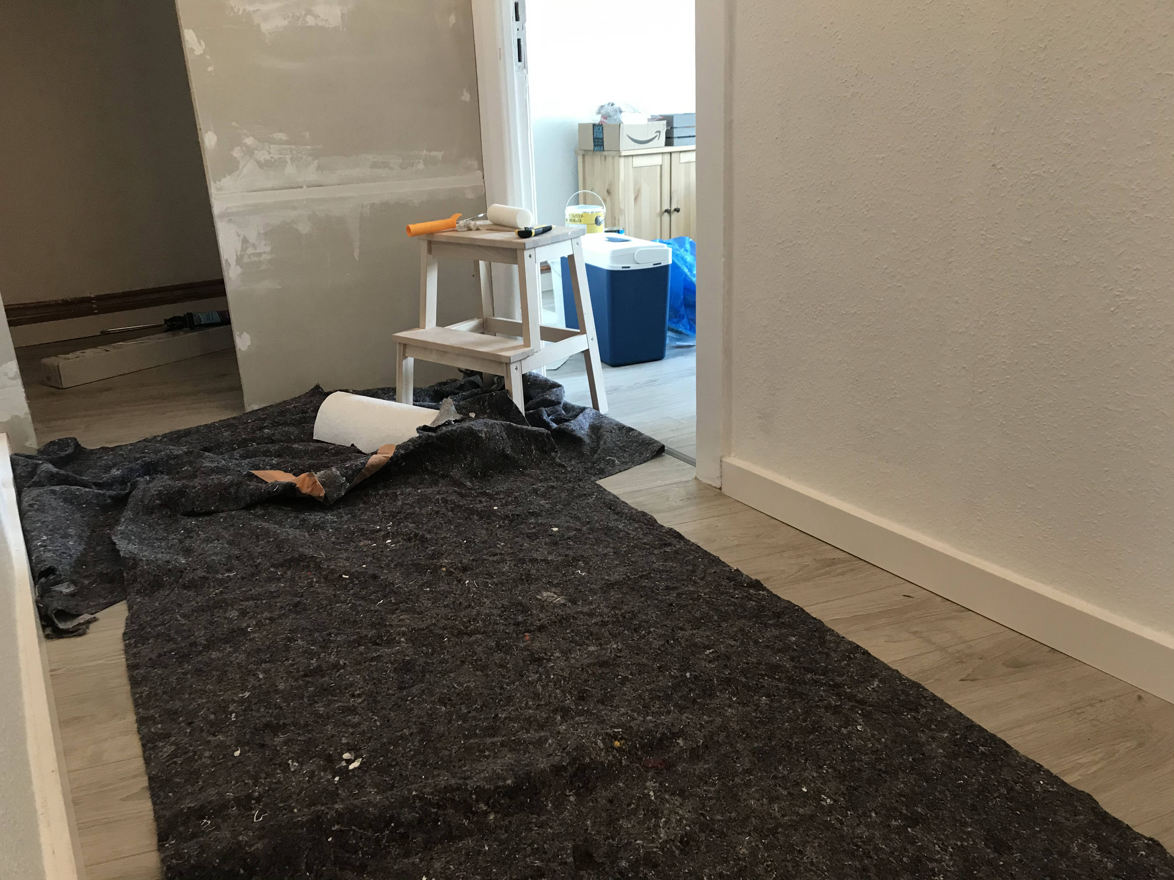 멀리서 보면 안 보였는데 발판 위를 올라가 가까이서 보니 정말로 벽지가 부풀어 올라있었다. 그리고 심지어 크기도 꽤 컸다. 사진 상으로는 작아 보이는데 거의 손바닥만큼 벽지가 일어났다. 그래서 검색을 해봤다. 짐작 가는 이유로는 첫 번째 접착제가 덜 말랐거나, 두 번째 페인트를 너무 많이 썼거나. 왠지 둘 다 일 것 같은 예감에 일단 하루 더 말리기로 했다 😂