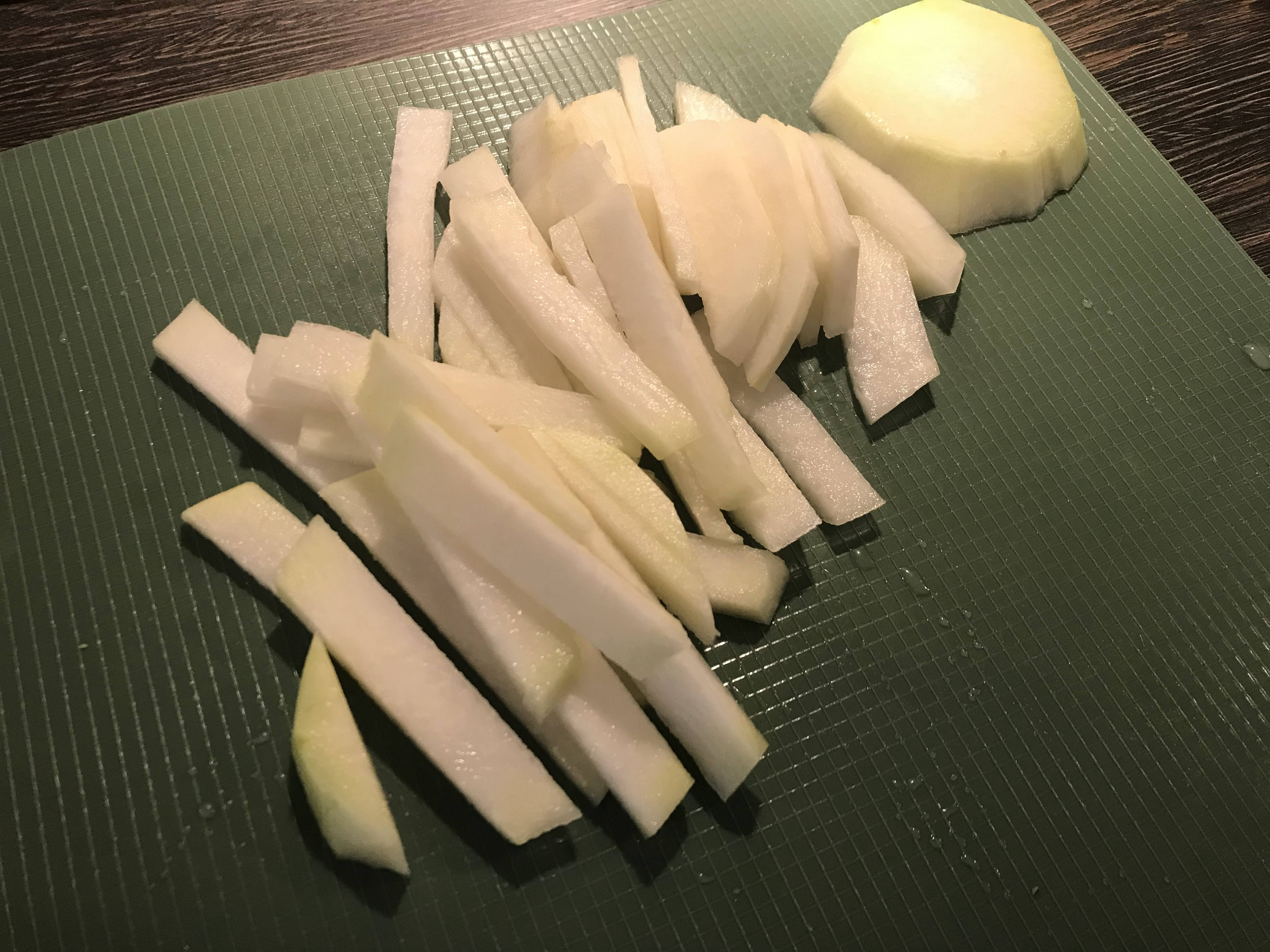 독일 마트에 무는 잘 안 팔아도 콜라비는 항상 판다. 자주가는 REWE에서 콜라비 하나당 0.89센트에 사 왔다. 사온 콜라비를 채 썰어준다. 큰 콜라비면 2인분, 작은 사이즈면 1.5인분 정도 나온다.