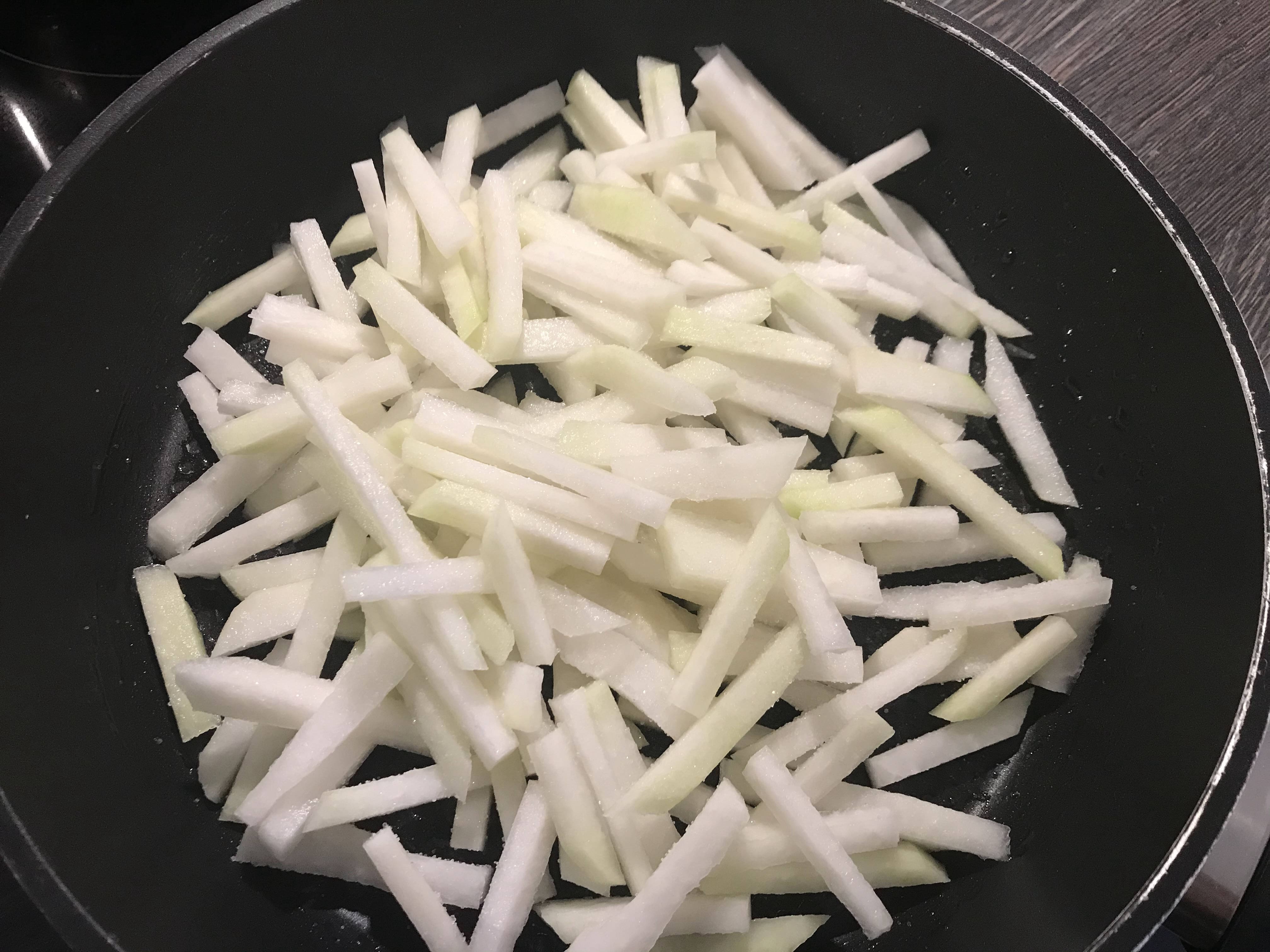 프라이팬에다가 채 썬 콜라비를 넣고 소금과 참기름을 조금 넣고 뒤적거리다가 물을 넣고 뚜껑을 닫아서 콜라비를 익혀준다. 들기름으로 많이 하던데 들기름이 없어서 참기름을 썼다.