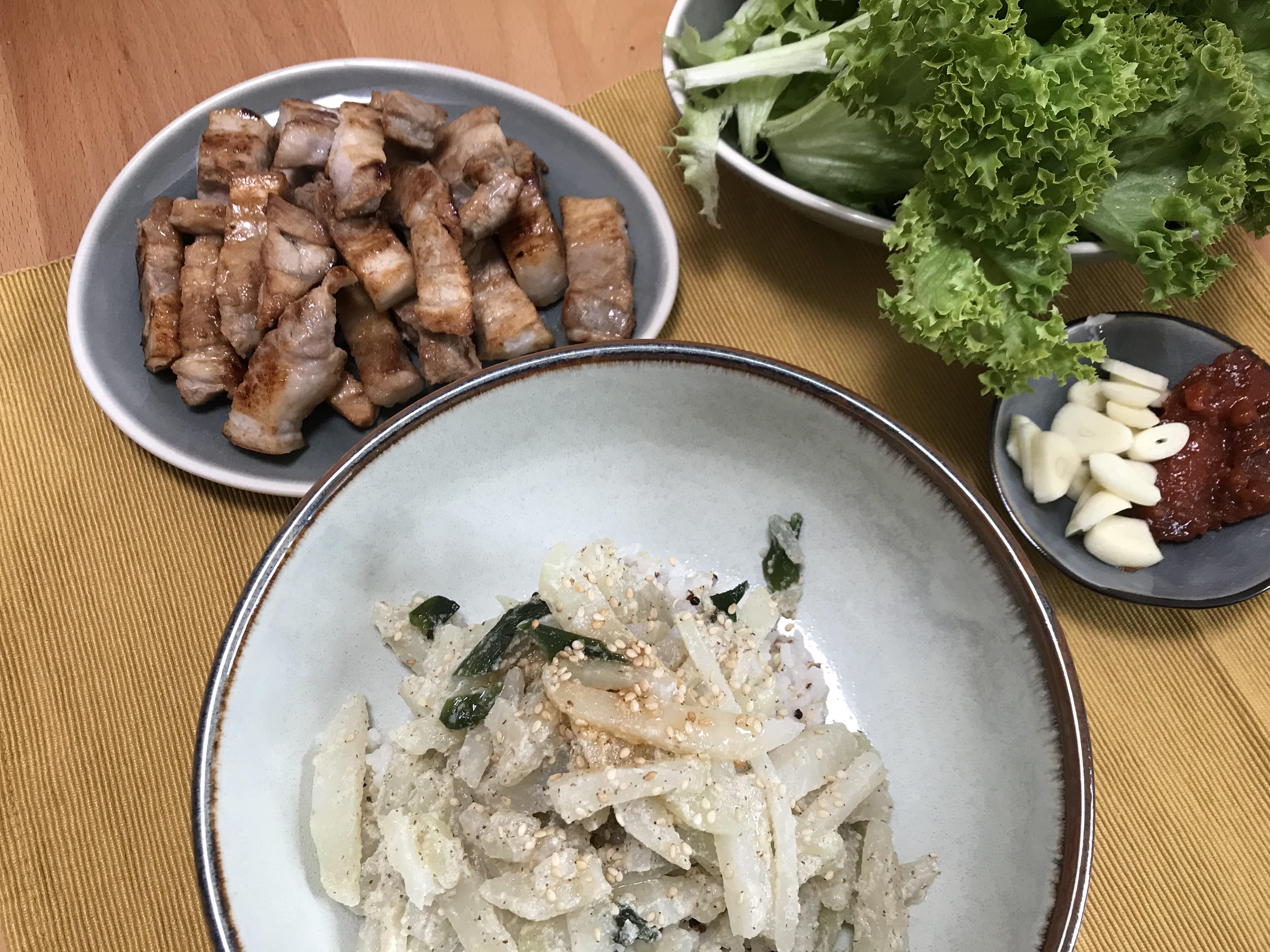 간단한데 너무 맛있어서 또 해 먹었다. 이날은 Arne가 없는 주말이라 내 맘대로 먹는 날! 고기도 구워서 생마늘이랑 같이 먹었다. 행복.. 요즘 무 대신 쓸 수 있는 콜라비에 빠졌다. 콜라비로 한 깍두기도 맛있었는데 무나물을 해도 맛있다. 다음은 콜라비로 소고기 뭇국을 해볼까