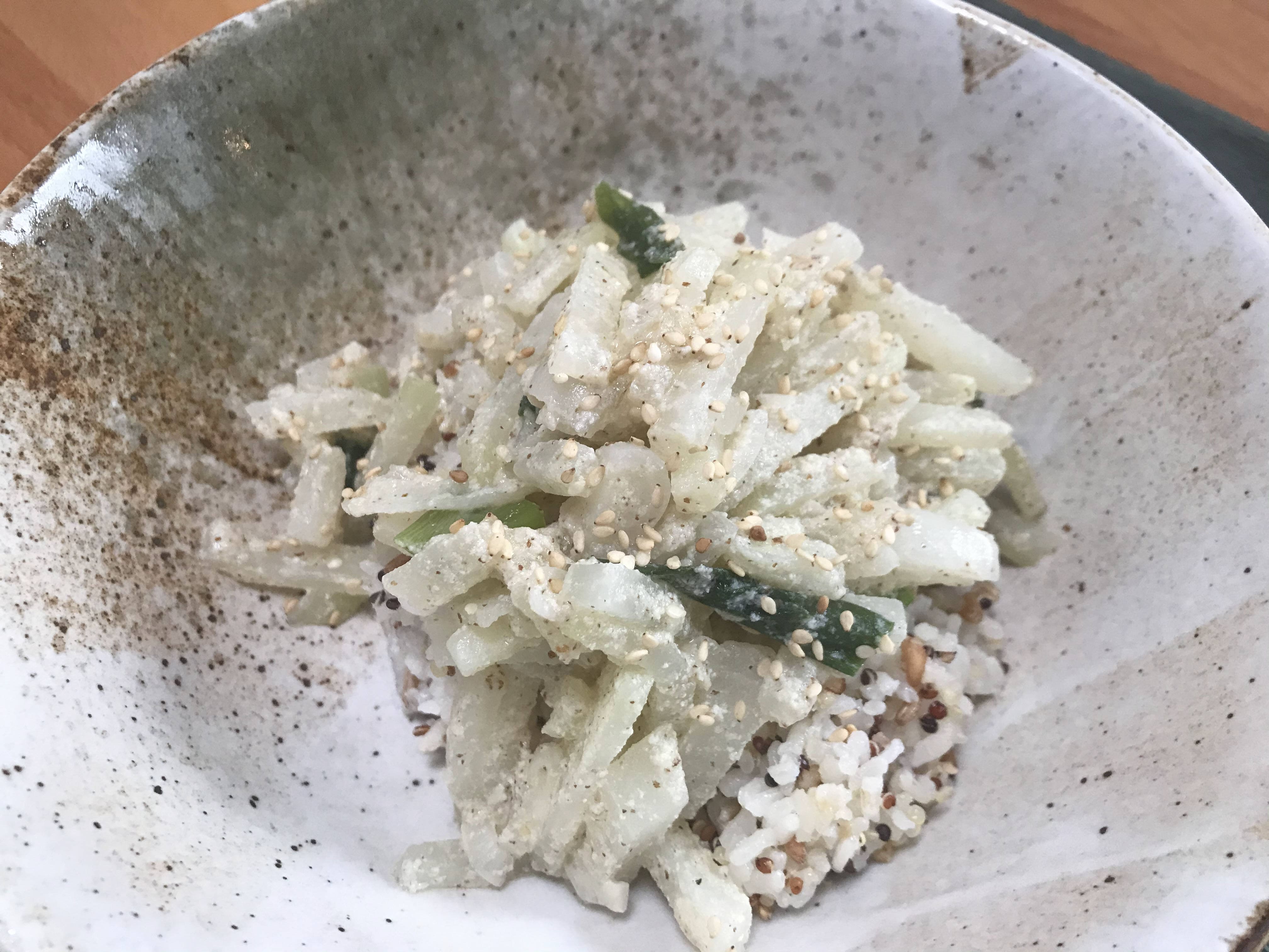 잡곡밥 위에다가 콜라비 나물을 얹고 깨와 참기름을 살짝 뿌려준다. 밥이랑 같이 먹으면 완전 한국의 맛..🇰🇷