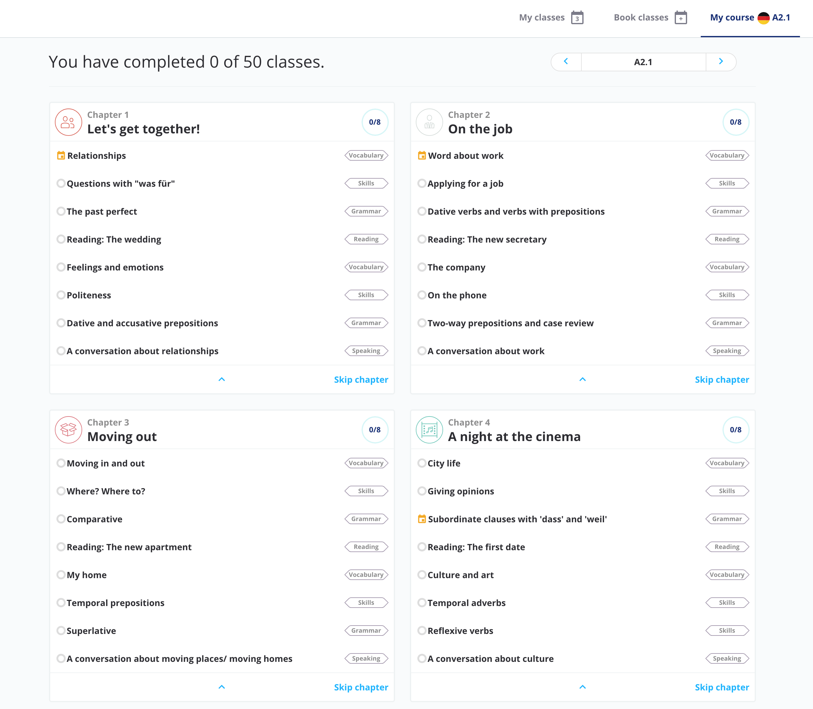 My course 탭을 클릭하면 챕터별 목차에 어떤 수업을 예약했고 수강했는지 한눈에 볼 수 있다. 그리고 각 주제를 클릭하면 그에 해당하는 다양한 선생님들의 강의를 보여줘서 쉽게 챕터별로 예약할수도 있다.