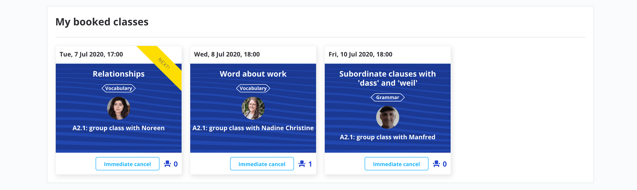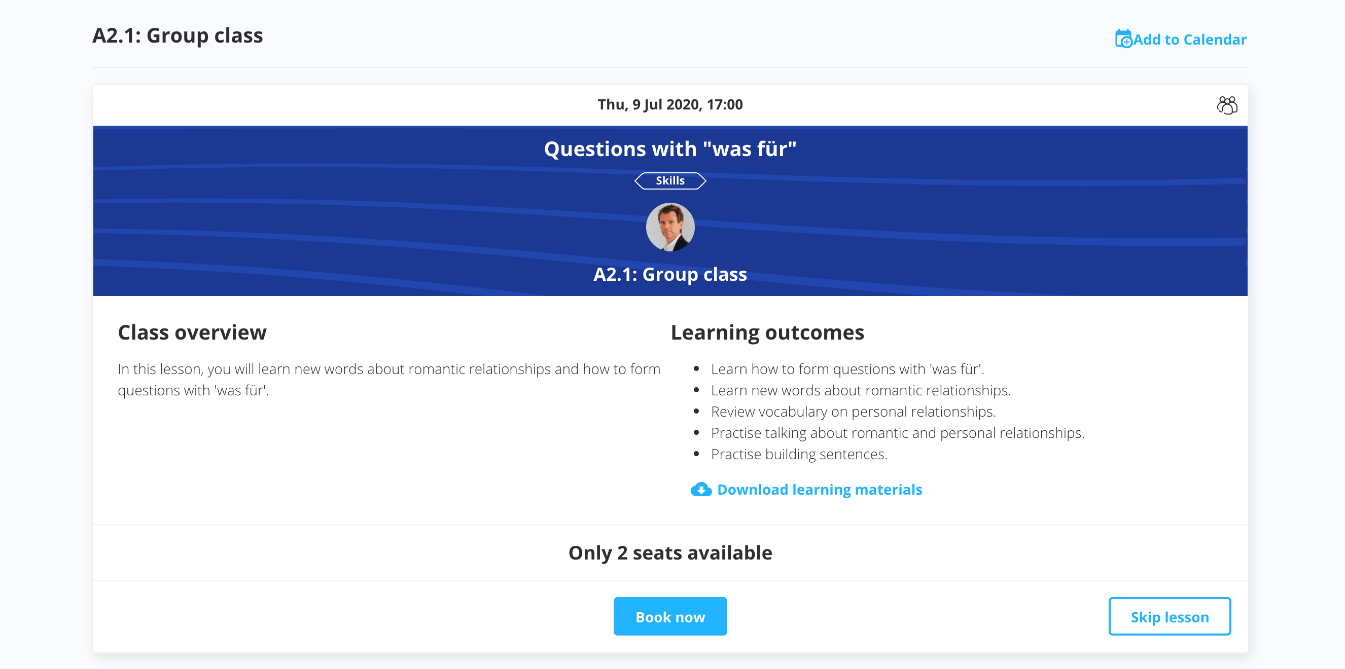 수업마다 상세 내용도 있어서 읽어보고 마음에 드는 수업으로 예약하면 된다. 수업마다 최대 인원은 5명이다. 문법, 스킬, 말하기, 단어, 읽기 등등 수업이 보였다.