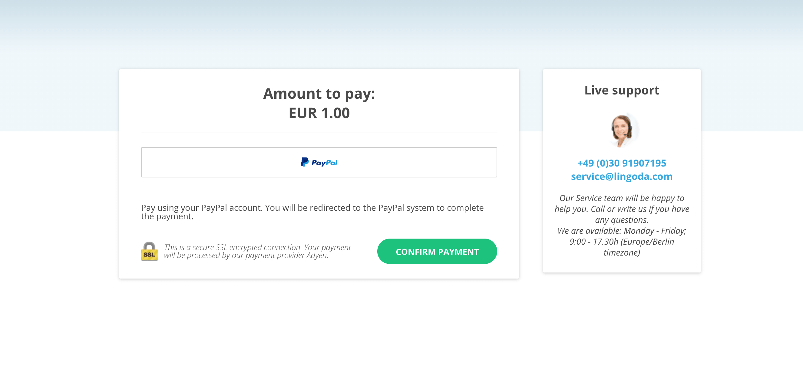 캡쳐에는 없지만 결제 방법(신용카드, 페이팔, 무통장입금) 중에 선택한다. 분명히 Free Trial이라고 적혀있었는데 왜 1유로를 내야 하는 건지. 1€ Trial이라고 적어놔야 하는 거 아닌가? 이전 페이지에서도 0€라고 뜨고 Trial을 하려면 돈을 내야 한다는 문구는 못 봤는데 결제 방식을 고르고 나면 이렇게 1유로를 내라고 뜬다. 체험하는 데에 1유로면 큰돈은 아니니까 일단 지불하고 다음 단계로 간다.