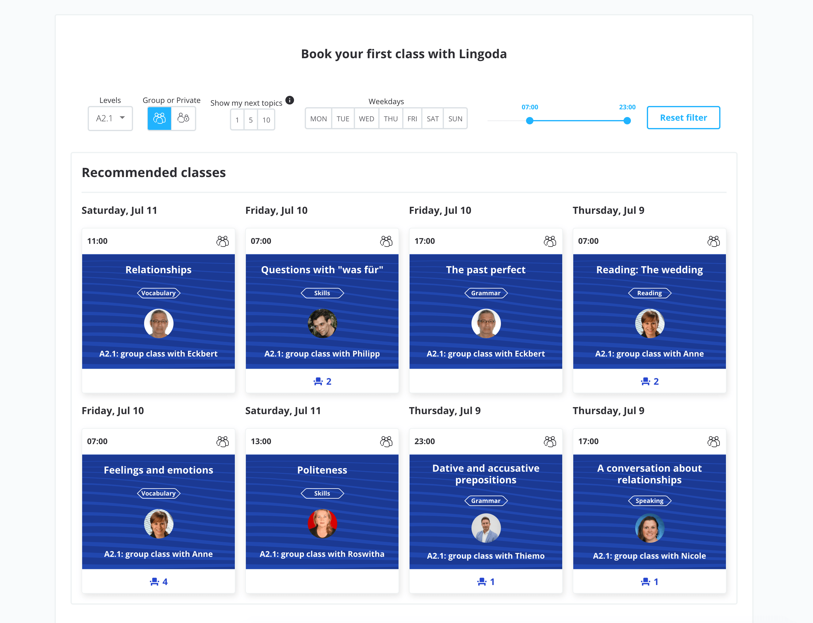 레벨을 고르고 나면 이렇게 요일, 시간에 따른 수업들을 보여준다. 아침 7시부터 저녁 11시까지 시간이 다양하다. 사정에 따라 유연하게 선택할 수 있는 게 링고다의 가장 큰 장점이다. 그리고 초반 레벨 설정에 너무 고심하지 않아도 되는 게 왼쪽 위에 보이는 것처럼 다른 레벨을 선택해서 초반에 고른 레벨이 아닌 다른 레벨의 수업들도 다 들을 수 있다.