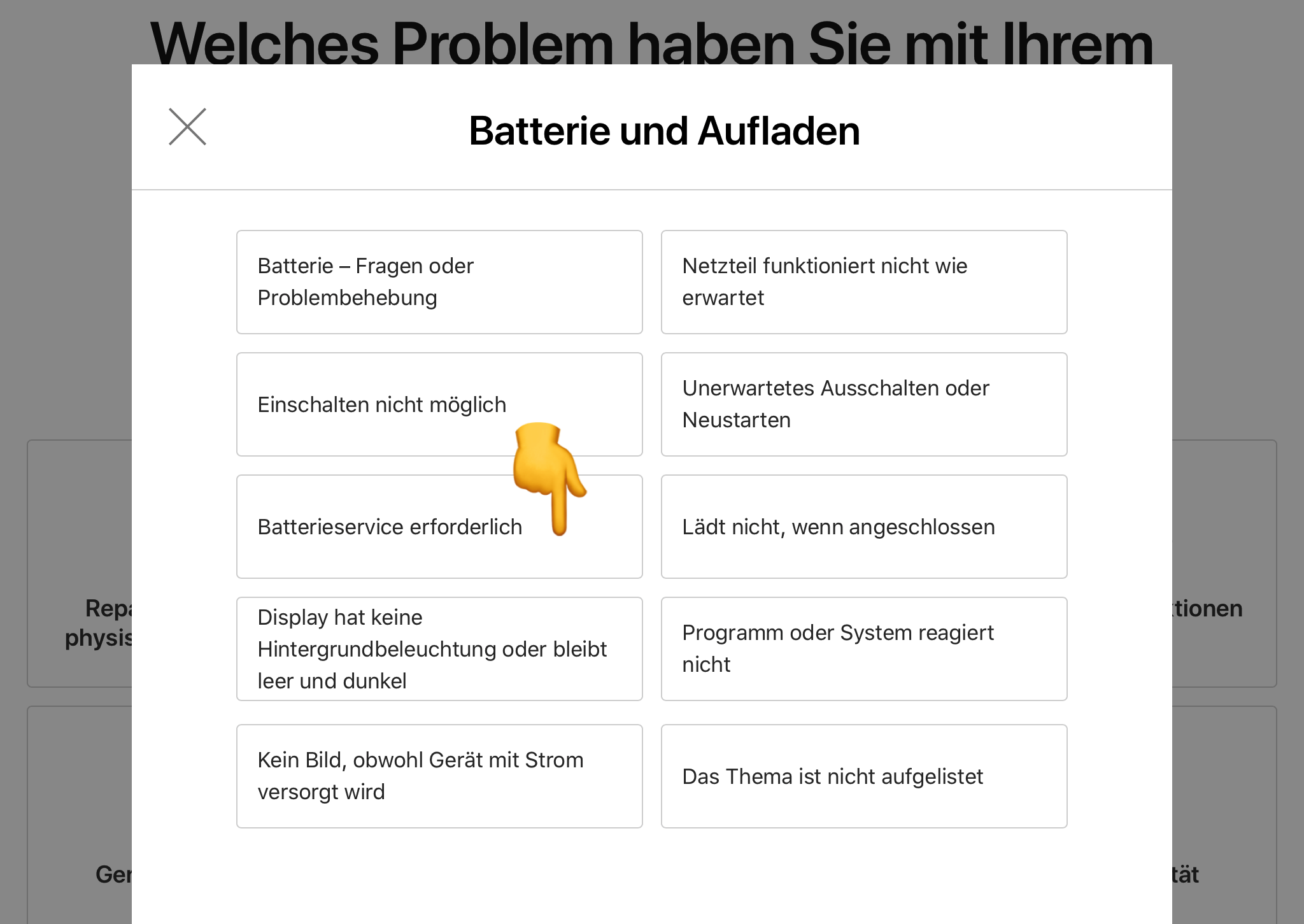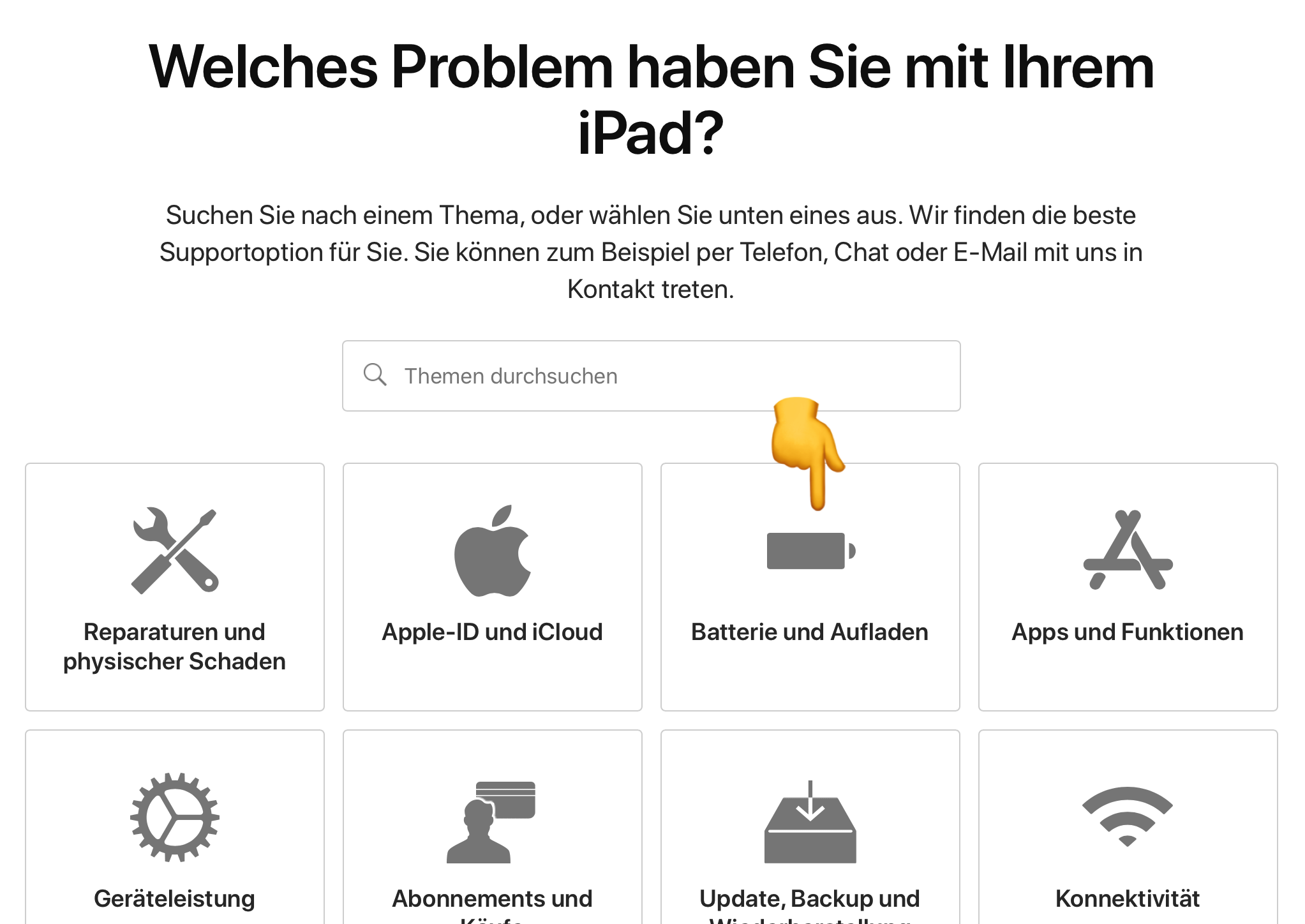 어떤 문제가 있냐고 묻는 화면에서는 배터리와 충전 Batterie und Aufladen을 선택한다.