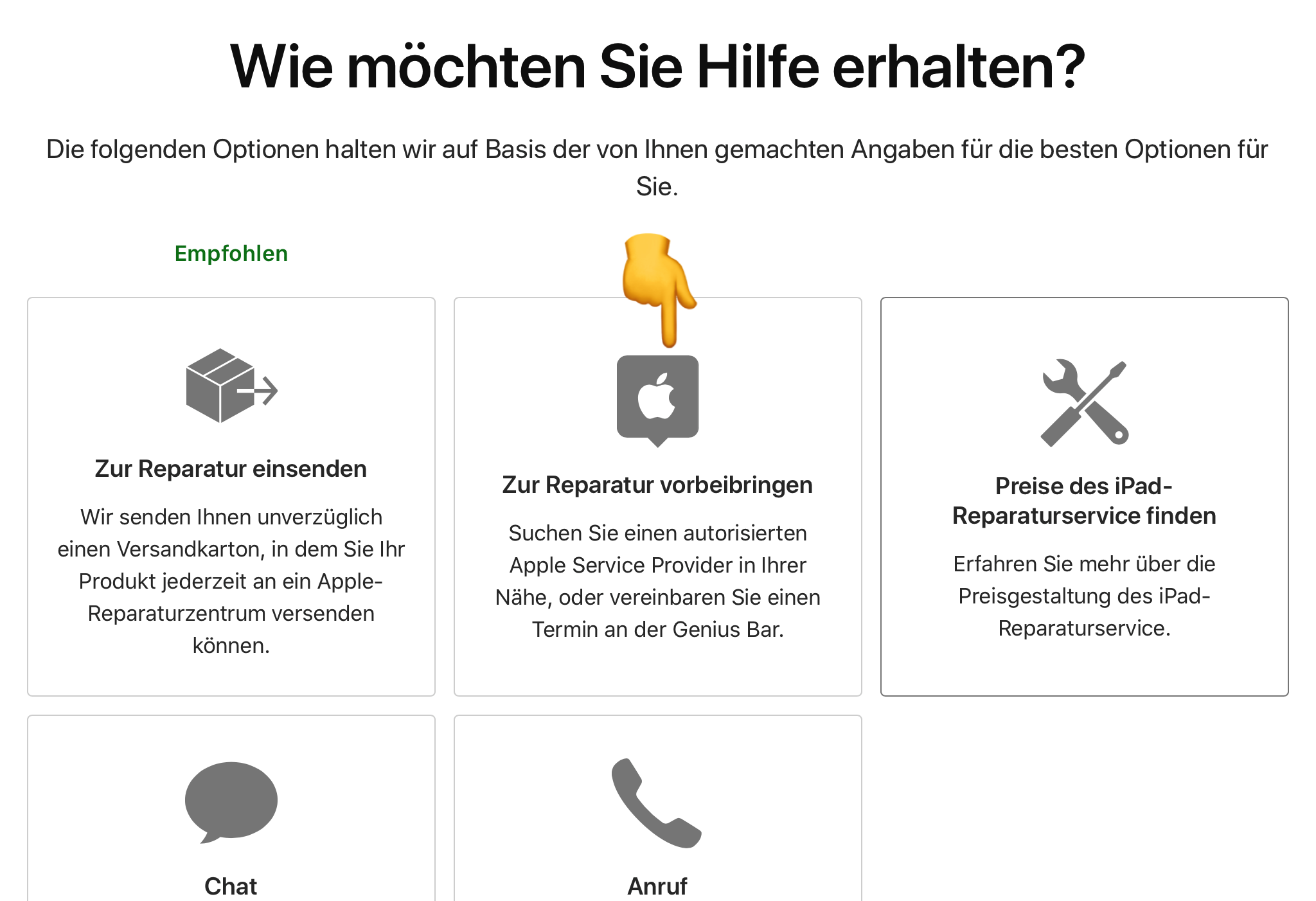 배터리 서비스(리퍼)를 받기 위해서 해당 제품을 택배로 보내거나 애플 스토어로 갈 수 있는데 직접 가는 것을 추천한다. 직접 애플 스토어 지니어스 바로 가는 옵션은 두 번째 Zur Reparatur vorbeibringen다. 여기까지 선택했한 다음에는 애플 아이디 로그인, 배터리 서비스(리퍼) 받을 제품의 일련번호 IMEI을 입력하고 나면 예약을 잡을 수 있다.