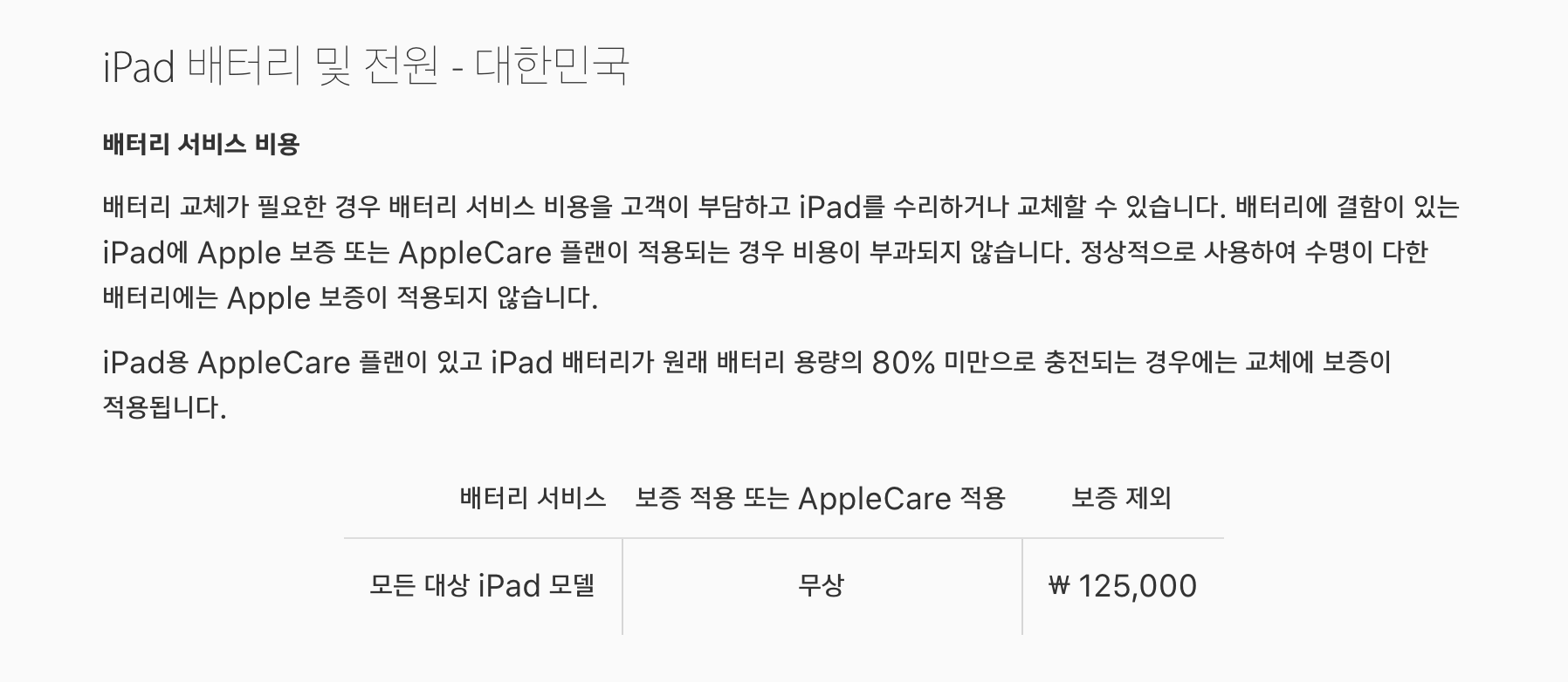 2014년인가 샀던 아이패드 에어 2가 요즘 따라 배터리가 너무 빨리 닳는다는 느낌을 받았다. 100% 충전시킨 아이패드를 넷플릭스 좀 보고 뭐 좀 하고 나면 벌써 20% 이하로 떨어져 충전을 하면서 사용해야 했다. 이전에는 이 정도까진 아니었는데 너무 불편해서 배터리를 교체받을까 하고 찾아봤다.
