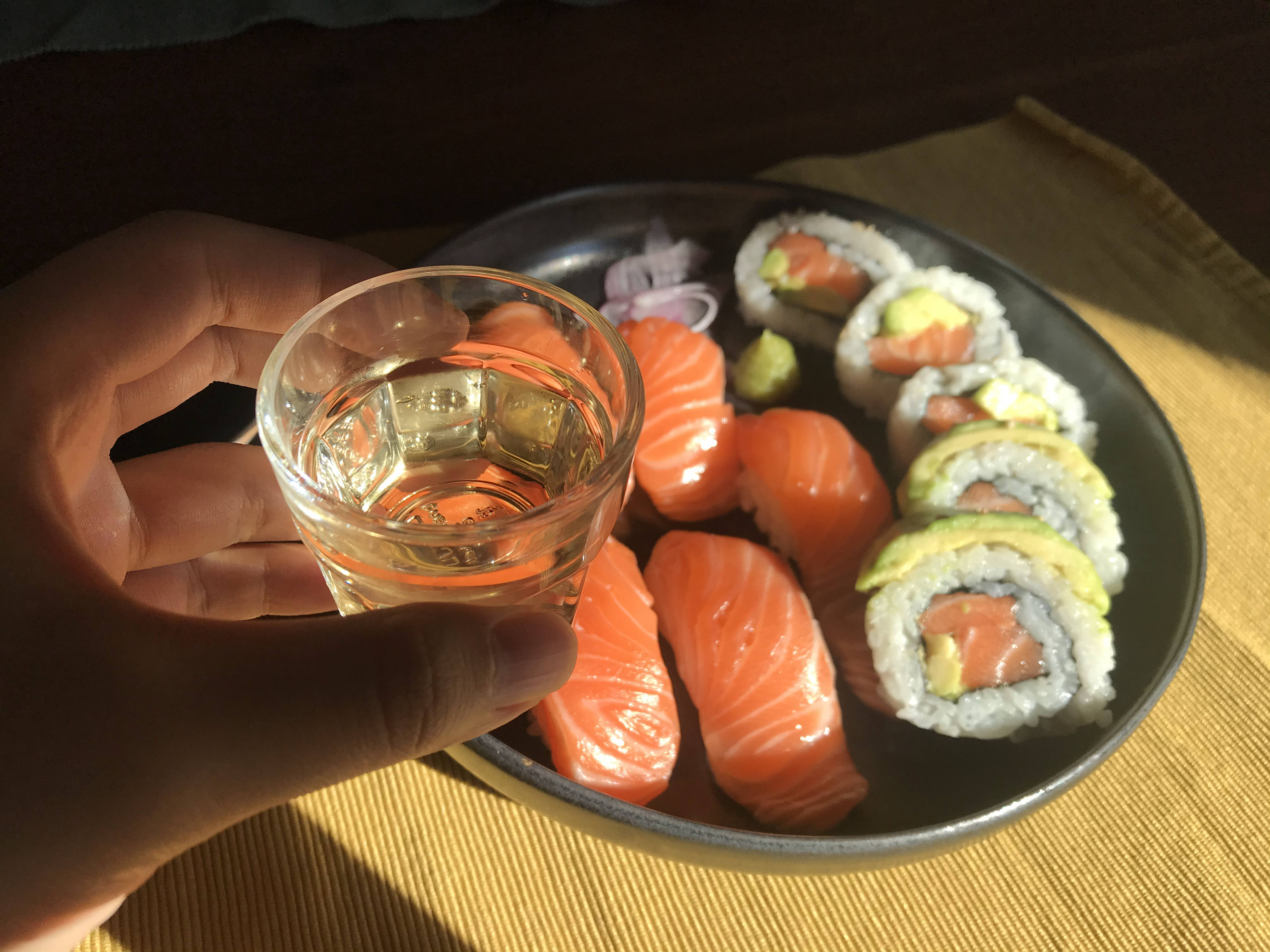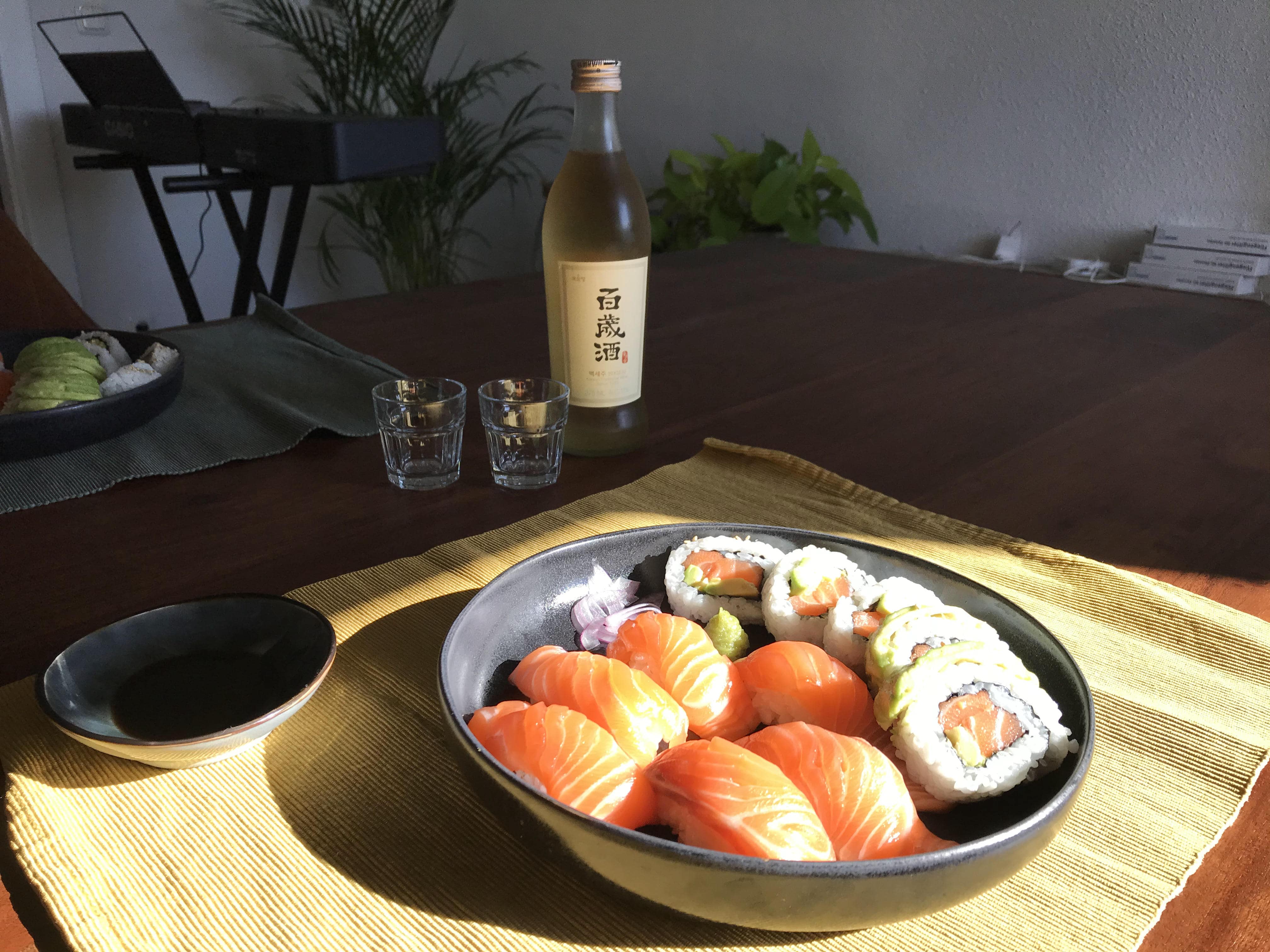 햇빛을 받아서 빛나는 연어 초밥 🤩 한인마트에서 Arne가 예쁘게 생겼다고 담은 백세주를 꺼내왔다. 한 번도 안 먹어봐서 이 날 땄는데..
