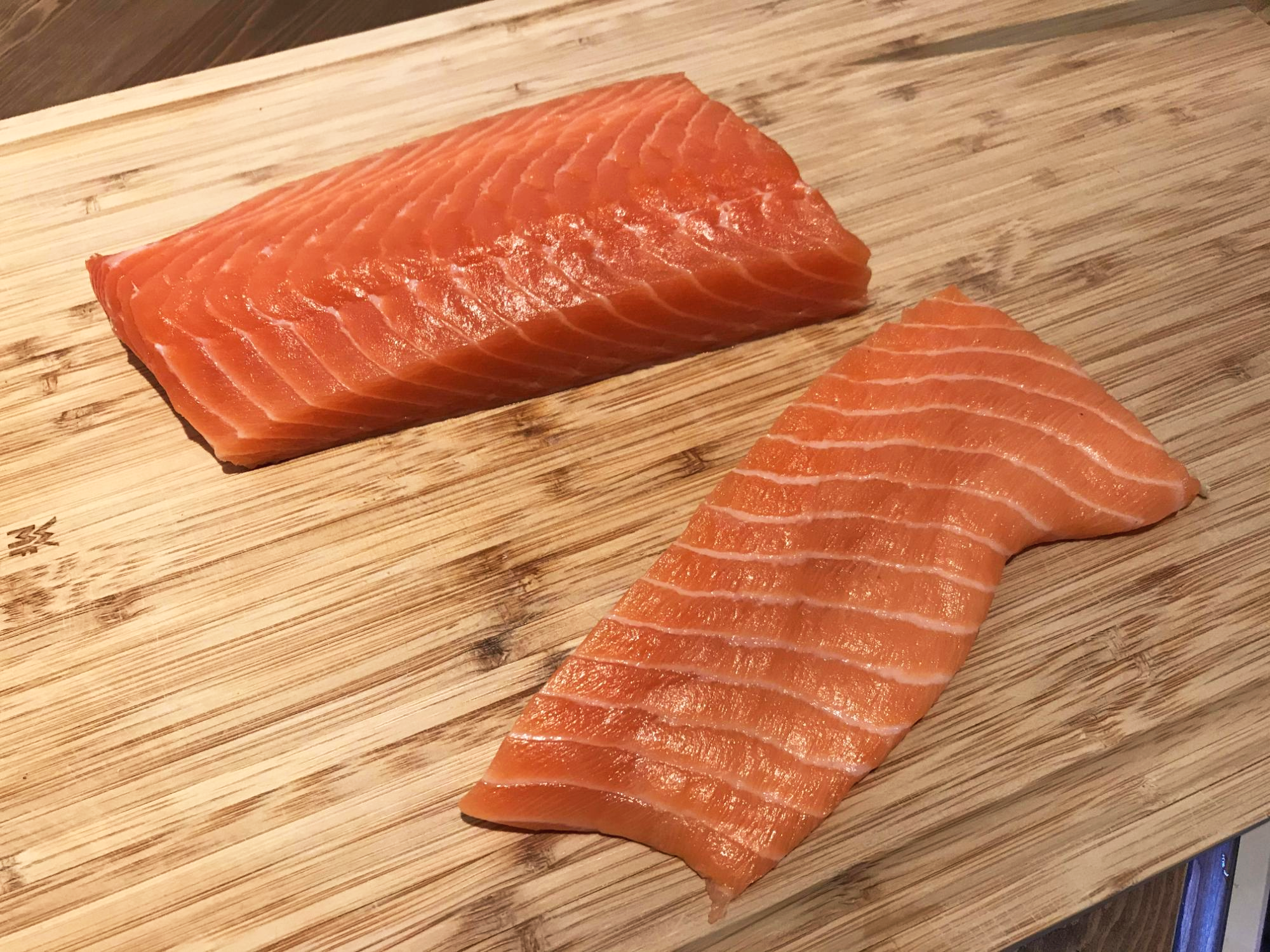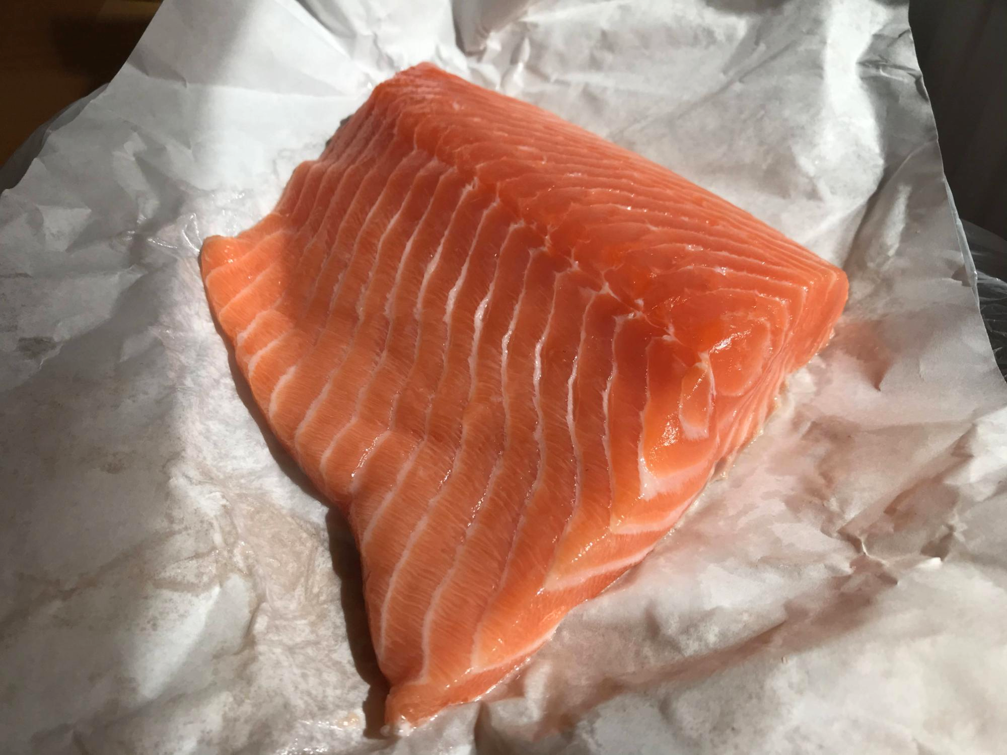 사온 연어를 초밥과 롤을 하려고 두 덩이로 잘랐다.
