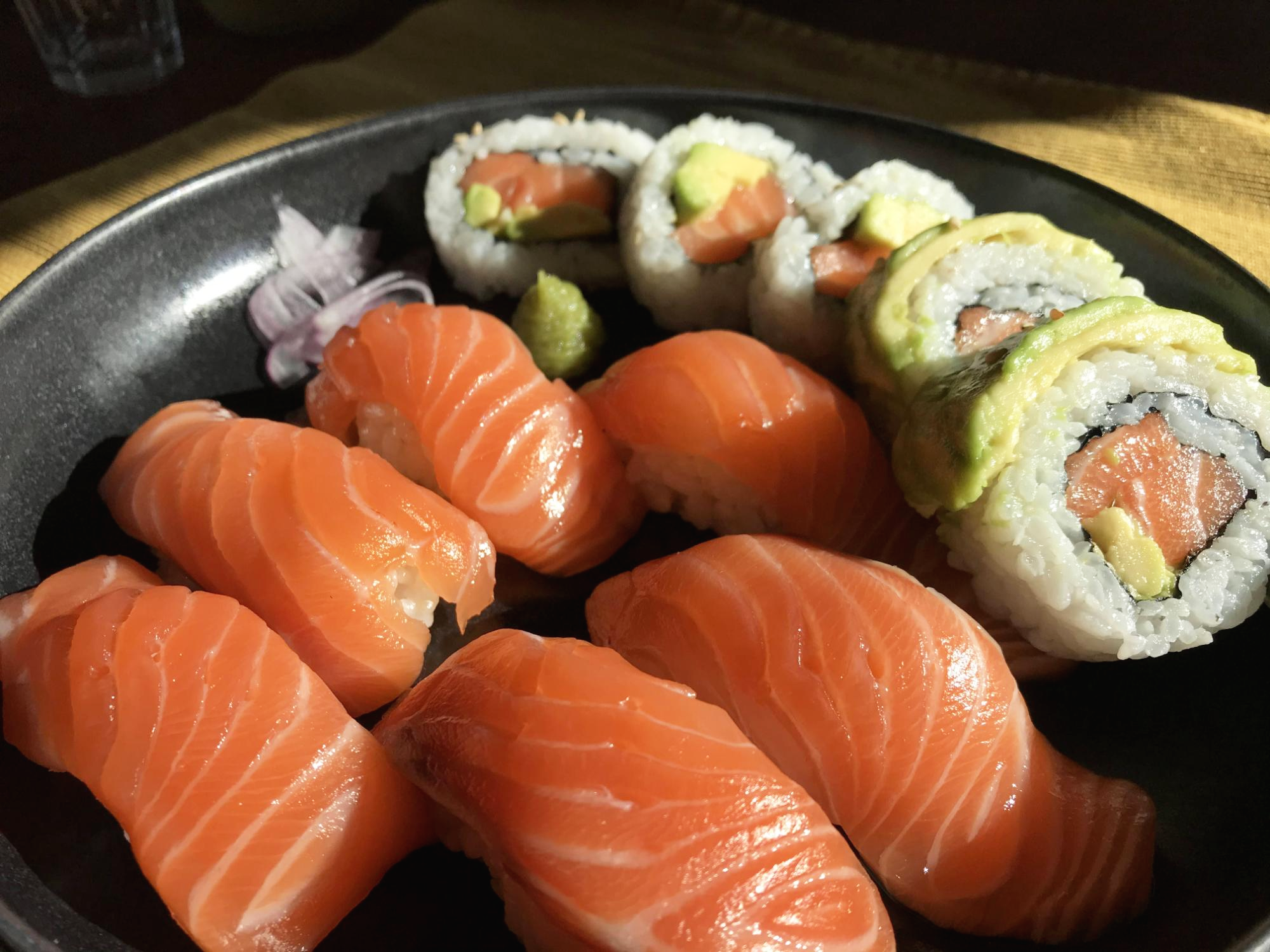 드디어 완성된 초밥과 롤! 생연어 400그람으로 이렇게 Arne와 내가 먹을 두 접시 나오고 초밥은 몇 피스 더 남았다.