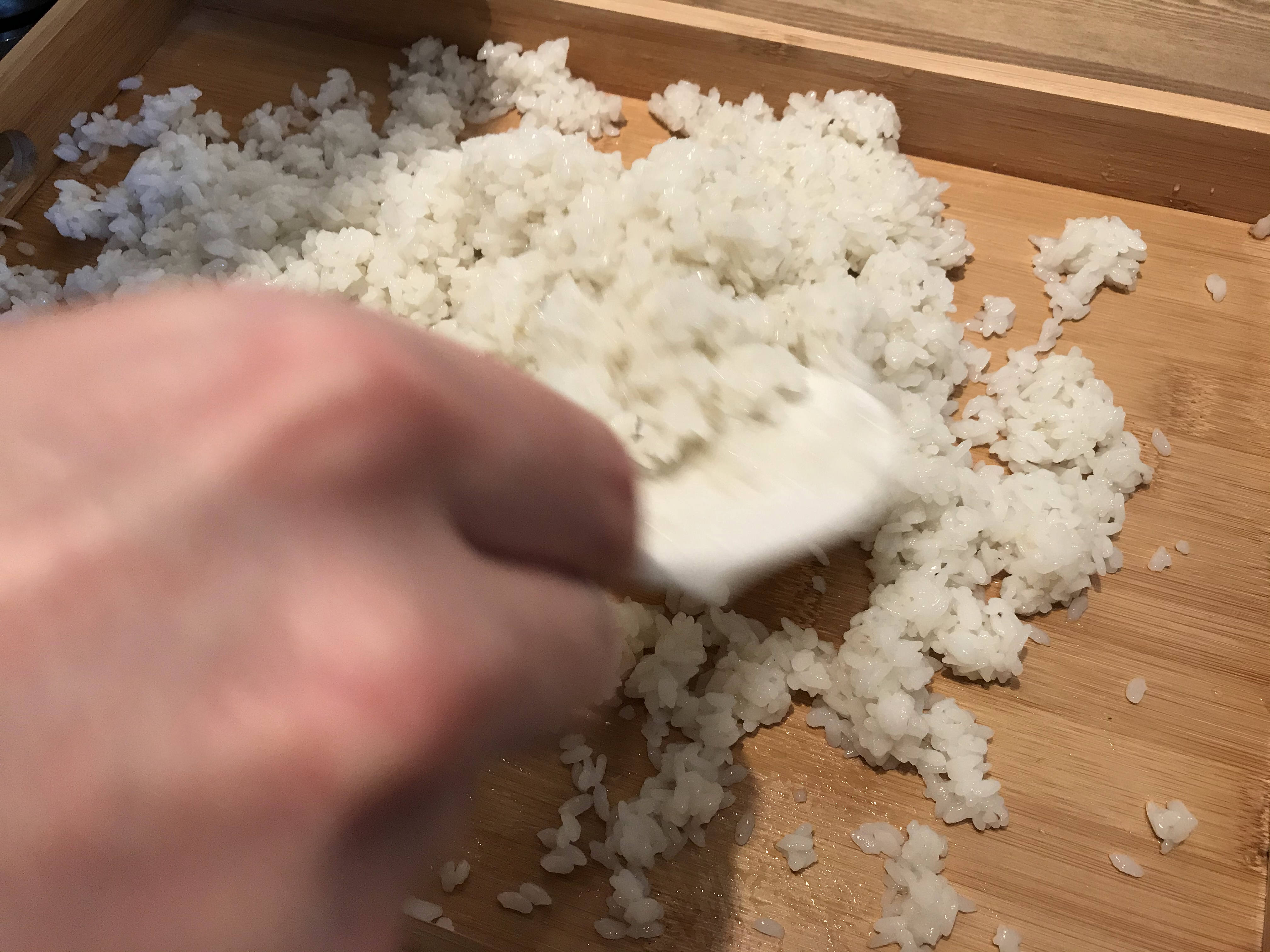 밥에 다가 배합초를 넣고 식히는 과정이다. 그 전의 과정들은 Arne가 했기 때문에 사진이 없다. 나는 그냥 대충 밥 지어서 하면 될 거라고 생각했는데 어디서 일본 주방장의 초밥 유튜브 영상을 보더니 제대로 하고 싶다고 쌀을 7번 씻고, 10분 말리고 10분 불리고 밥 짓고 10분 뜸 들이고.. 이런 과정들을 하느라 나는 그냥 거실에 누워있었다. 배합초는 식초 3, 설탕 2, 소금 1 비율로 넣어서 만들어준다. 대충 그릇에다가 하면 안 되냐고 했더니 유튜버가 최대한 넓은 곳에 하라고 했다며 내 쟁반에다가..🤦🏻♀️그래도 이 날은 Arne가 요리사였기 때문에 나는 가만히 있었다.