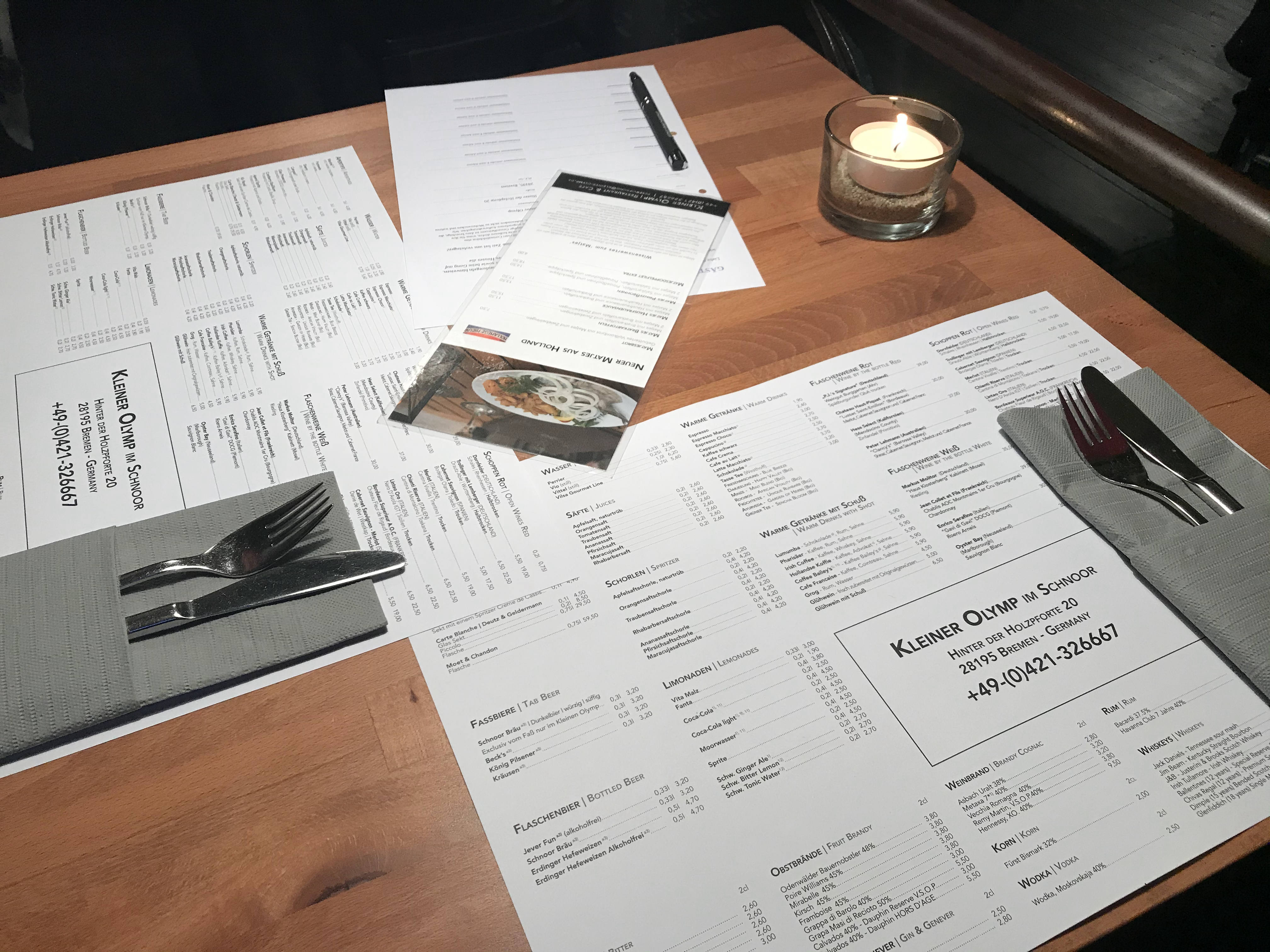 브레멘으로 여행을 가는 게 정해지자마자 Arne는 가서 해산물을 꼭 먹어야 한다며 해산물 식당을 찾았다. 우리가 간 식당은 Kleiner Olymp로 Schnoor라고 예전 건물들이 그대로 남아있는 구역에 있는 해산물 식당이다. Schnoor에는 건물들도 다 아기자기하고 구경할 거리도 많아서 여기서 구경하다가 저녁을 먹으면 된다. 우리는 토요일 저녁에 방문 예정이라서 미리 예약을 잡아놨다. 며칠 전에 예약 전화를 했을 때 7시로 문의하니 다 찼다며 8시로 예약을 할 수 있었다. 저녁 먹기엔 조금 늦어서 일찍 예약을 하는 것을 추천한다.