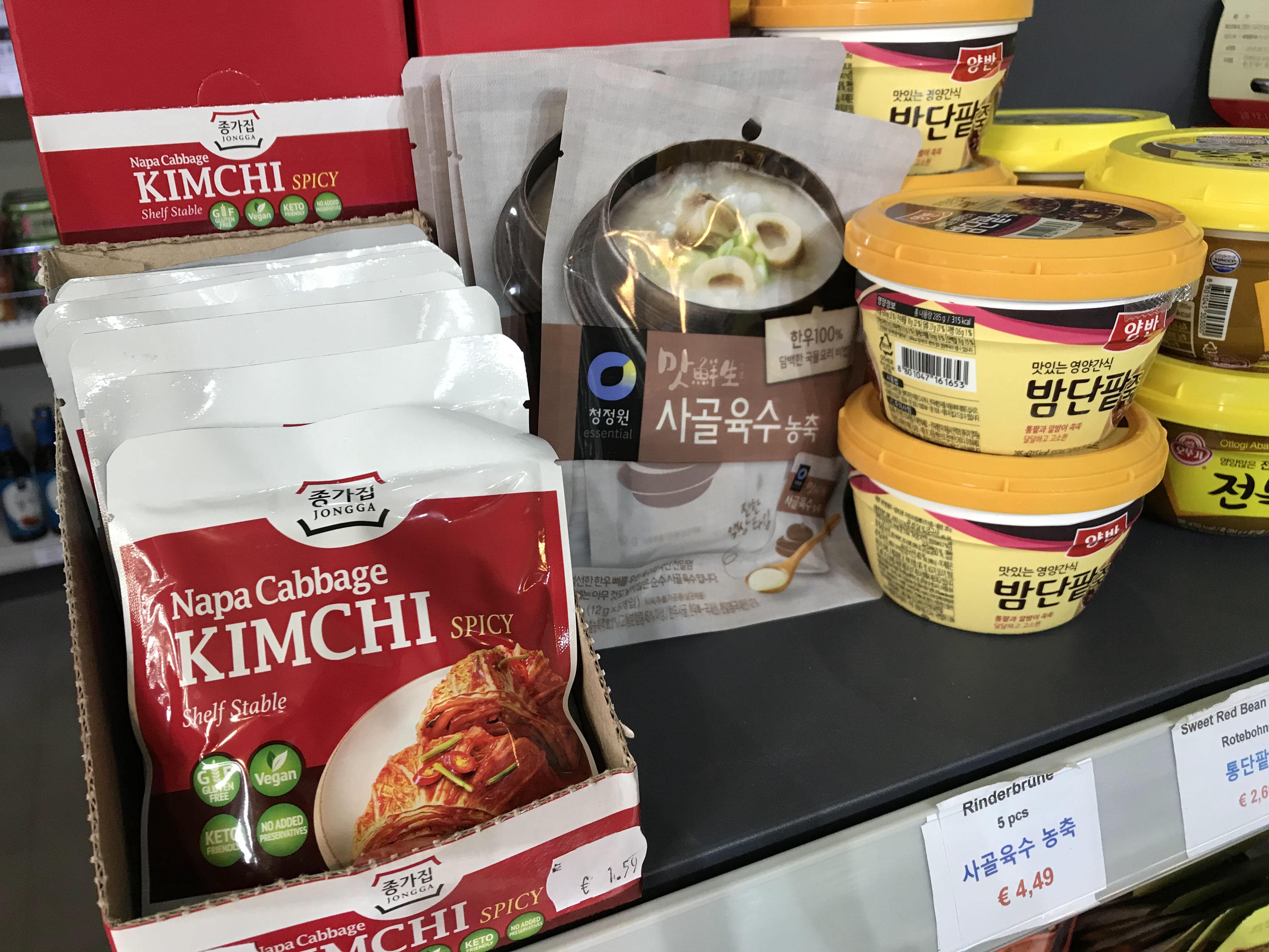 두근두근하면서 가게에 들어갔는데 들어가자 마자 보이는 사골육수 농축액!!!!!!!!!! 한국에 가면 꼭 사 와야지 하고 리스트에 적어놨던 건데 imart에 있었다. 미풍에도 팩으로 된 사골육수는 팔지만 농축액은 안 파는데 대박이다. 사골육수 분말도 아니고 농축액을 발견해서 너무 반가운 나머지 사장님께 여기 사진 좀 찍어도 되냐고 물어본 뒤 사진을 찍었다. 가격은 4.49유로라고 하니 조금 비싸게 느껴지지만 5포가 들었고 1포당 1유로도 안 되는 가격이니 괜찮은 것 같다.