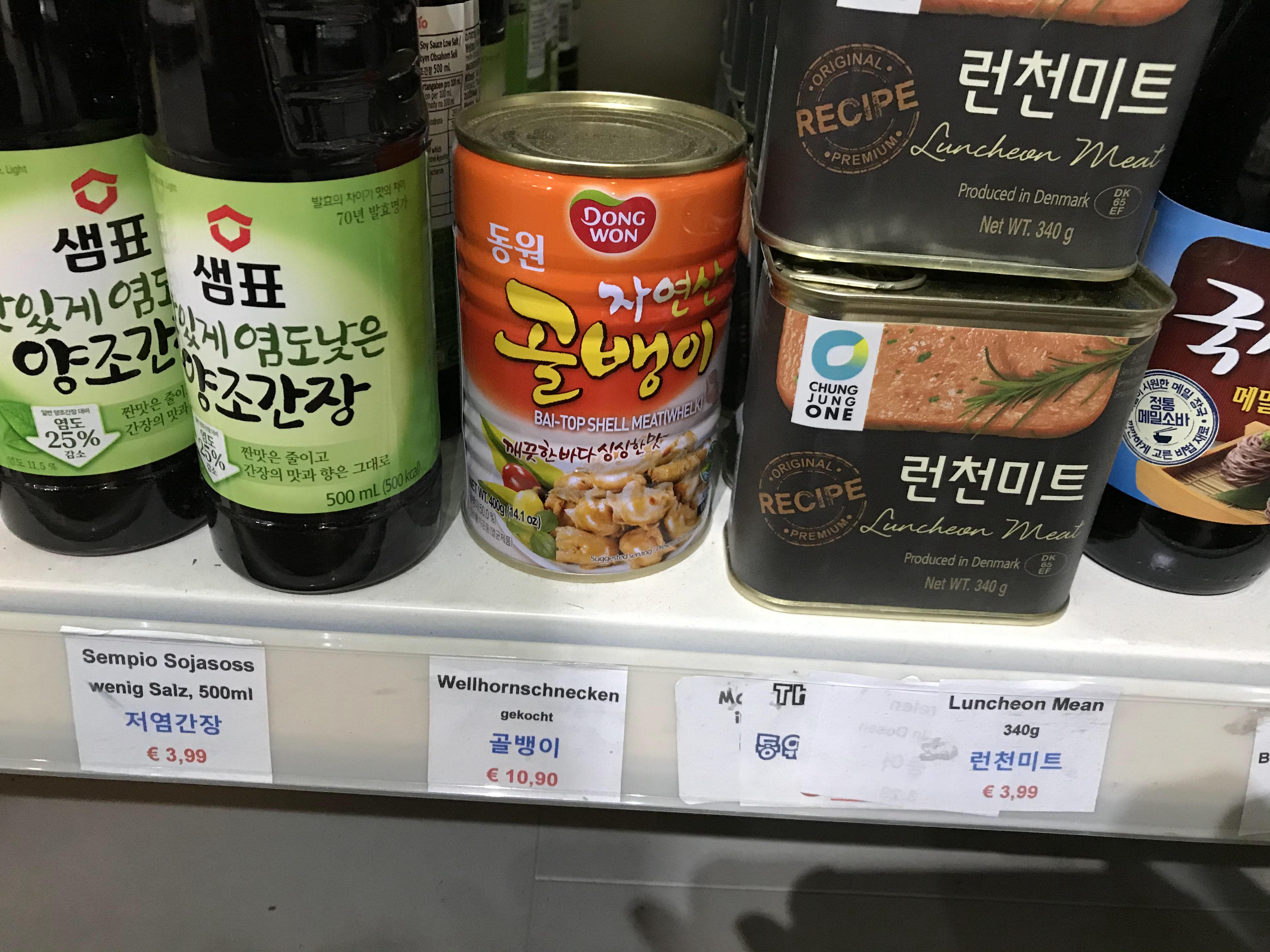 골뱅이!!!! 너무 반가웠지만 10유로나 했기 때문에 더 이상 반갑지 않았다. 유동도 아니고 동원껀데 비싸네! 😭한국에서도 골뱅이가 비싸긴 하지만... 미풍에도 골뱅이를 판다던데 가보니 없었다. 있다가 없다가 하는가 보다. 함부르크에서 골뱅이를 먹고 싶다면 imart로! 근데 imart에도 별로 없나 보다. 저거 한 캔이 마지막이었다.