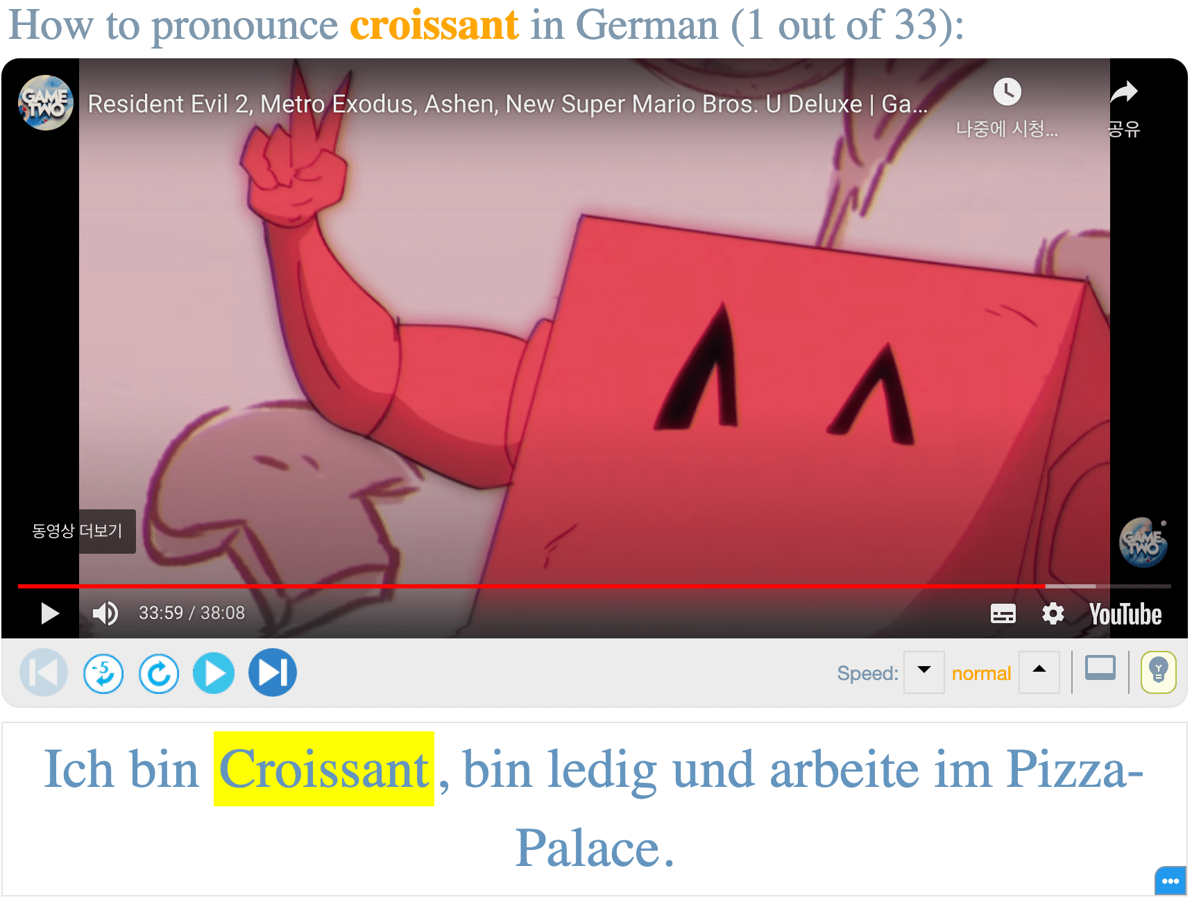 Youglish라고 특정 단어를 검색하면 그 단어가 쓰이는 영상을 찾아준다. 내가 보던 유튜브의 영상처럼 드라마를 보여주는 건 아니지만 유튜브에 있는 영상들 중 해당 독일어가 쓰인 영상을 찾아준다. 독일어 발음도 들을 수 있고 그 단어가 쓰이는 문장도 같이 배울 수 있어서 너무 유용하다.