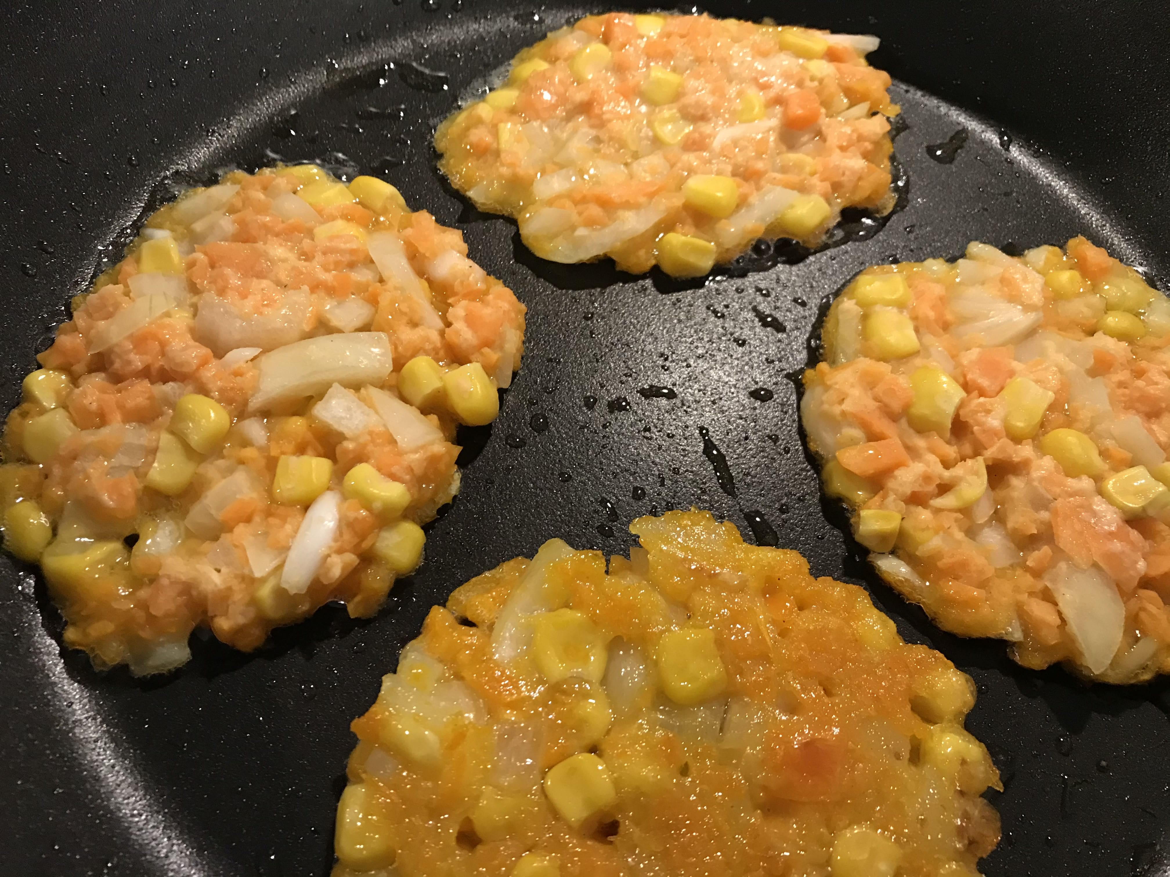 채썬 당근과 양파, 콘, 부침가루를 넣고 섞어준다. 소금으로 간도 해준다. 보통 전에 계란도 넣는 것 같은데 나는 반죽 반은 남겨두고 내일 먹으려고 계란은 안 넣었다. 그리고 오일을 가득 뿌리고 달궈진 팬에 작게 굽는다. 요리 유튜버들이 왜 흰 팬을 쓰는지 사진을 찍어보니 알겠다. 청소하기는 검은 팬이 좋지만 사진을 찍을 때는 좀 별로 안 예쁘게 나오는 것 같다.하지만 난 유튜버도 아니니까 대충 찍었다.