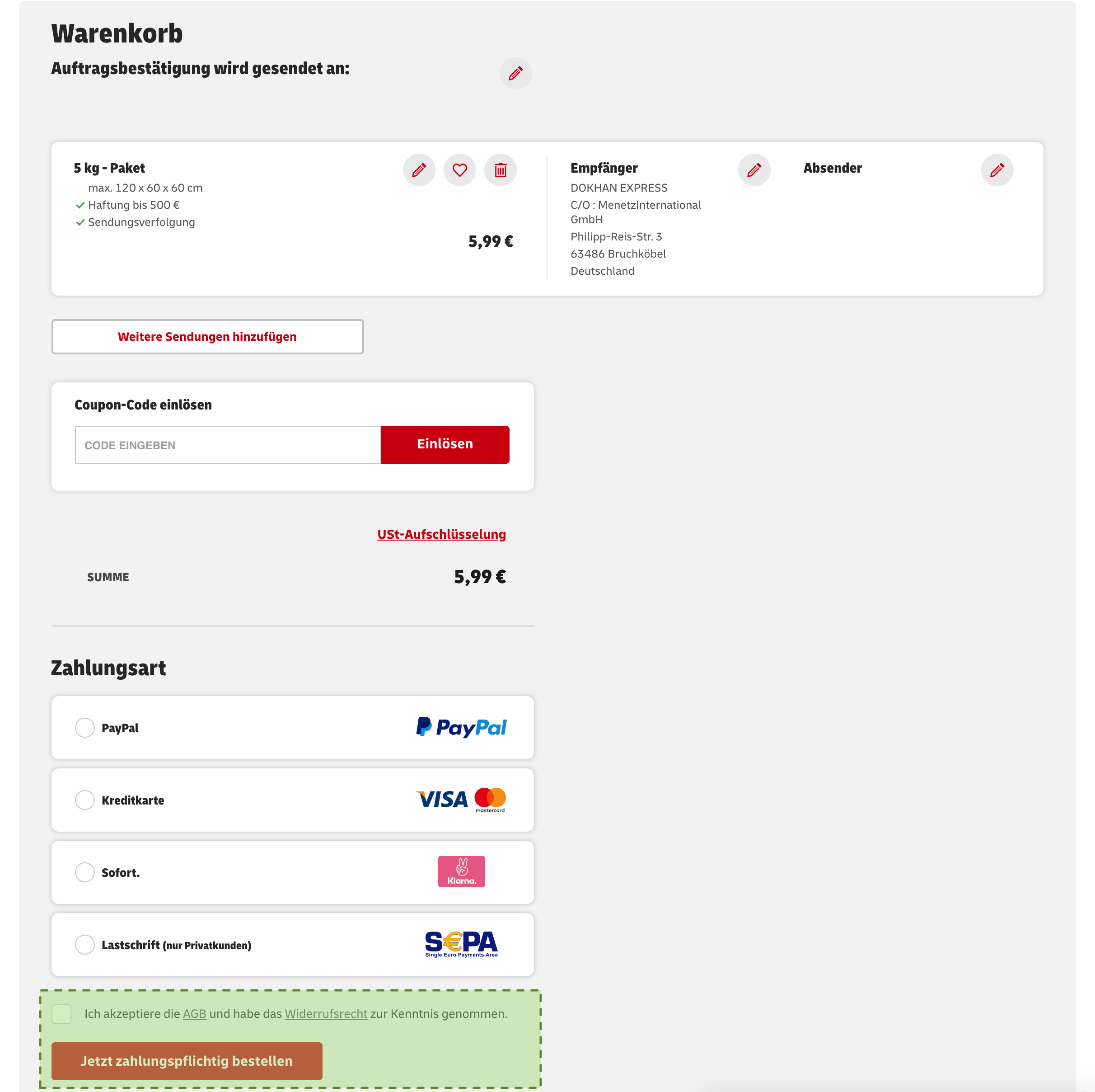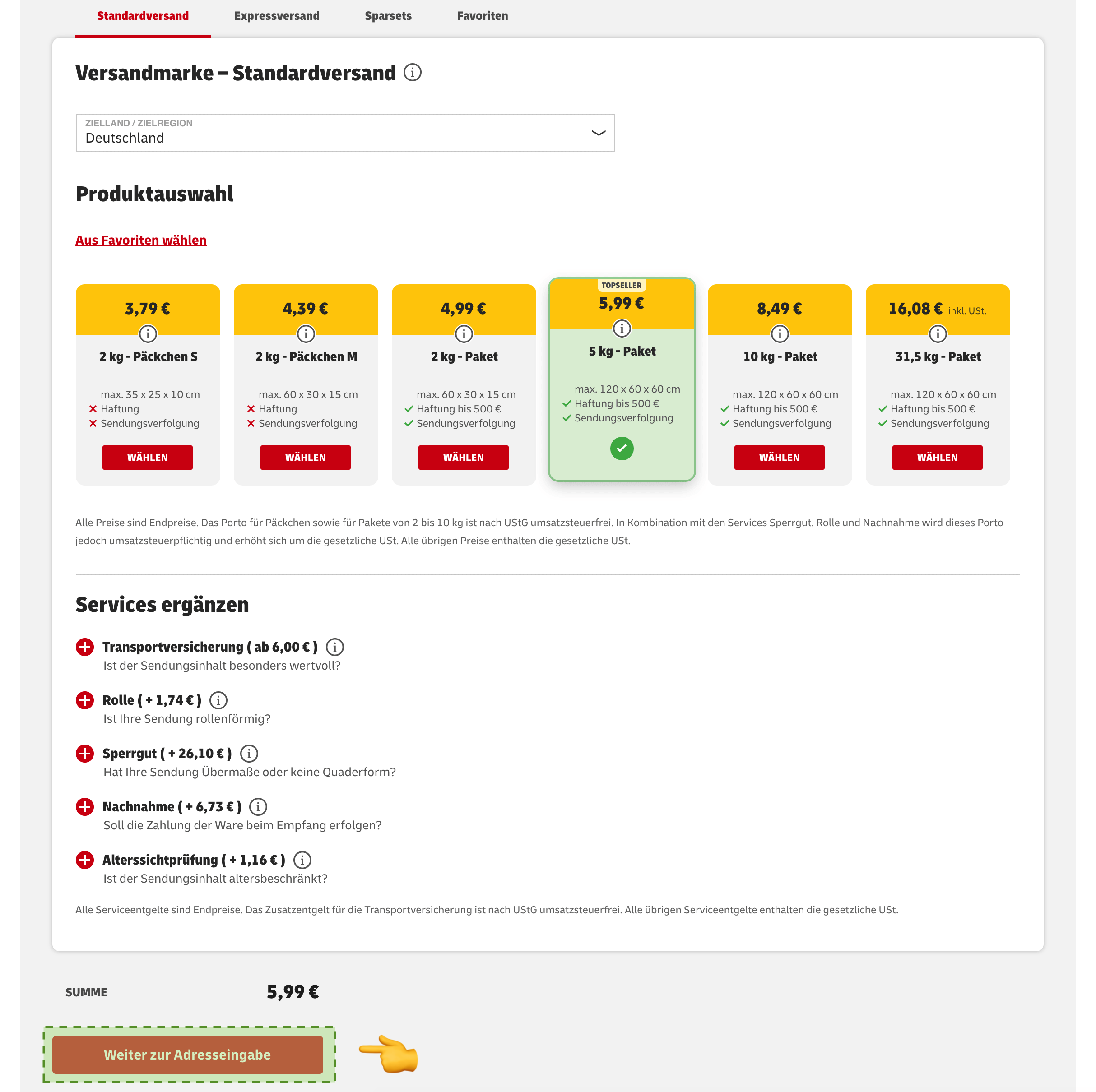 온라인으로 보내면 5,99€인데 직접 가서 접수하면 내는 비용(Filialprice)이 7,49€로 1,5€나 차이 나니까 온라인으로 접수하는 걸 추천한다.