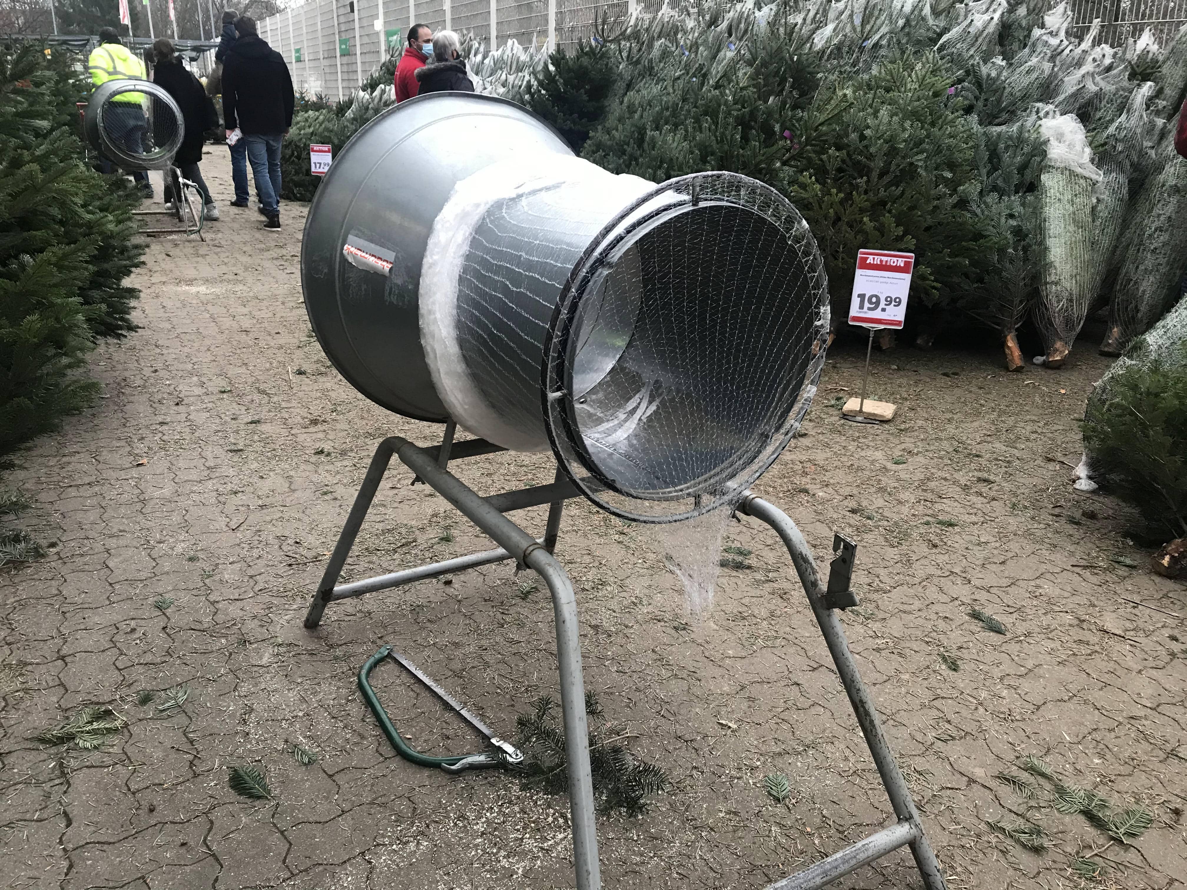 옆에 트리를 보면 그물망에 싸여있는 걸 볼 수 있는데 트리를 고를 때 풀어봐도 된다. 옆에선 한 커플이 그물을 째고 열면서 트리를 고르길래 우리도 쳐다봤는데 그 트리를 산다고 하니까 이 기구를 이용해서 다시 포장을 해줬다. 트리를 사면 가끔 가지들이 고르게 있는 게 아니고 한쪽이 비어있거나 위쪽이 비어있거나 할 때가 있다. 이런 나무는 장식을 달아도 예쁘지가 않다. 특히 위쪽이 휑하게 비는 건 별로다. 우리도 열어봐야 하나 고민했지만 서프라이즈로 하자며 제일 뚱뚱한 걸로 골랐다.