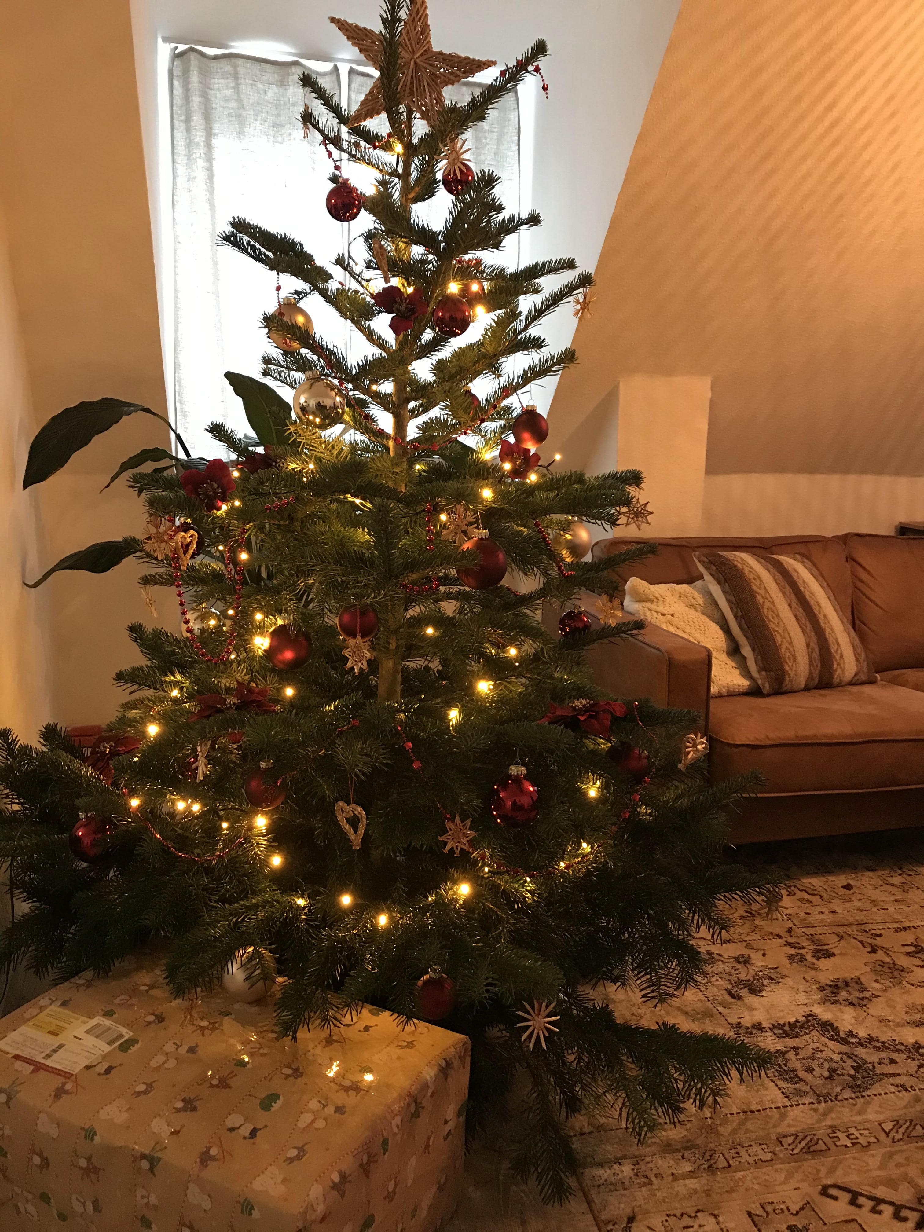집에 와서 열어보니 대충 골랐는데도 위아래 풍성해서 마음에 들었다. 어디 놓을지 고민하다가 소파를 오른쪽으로 좀 더 밀어서 공간을 만든 다음에 놨다. 이 날 바로 장식들도 달고 싶었지만 Arne가 다음날 아침에 파자마 입고 캐롤 들으면서 하자고 해서 일단 그냥 놔뒀다.
