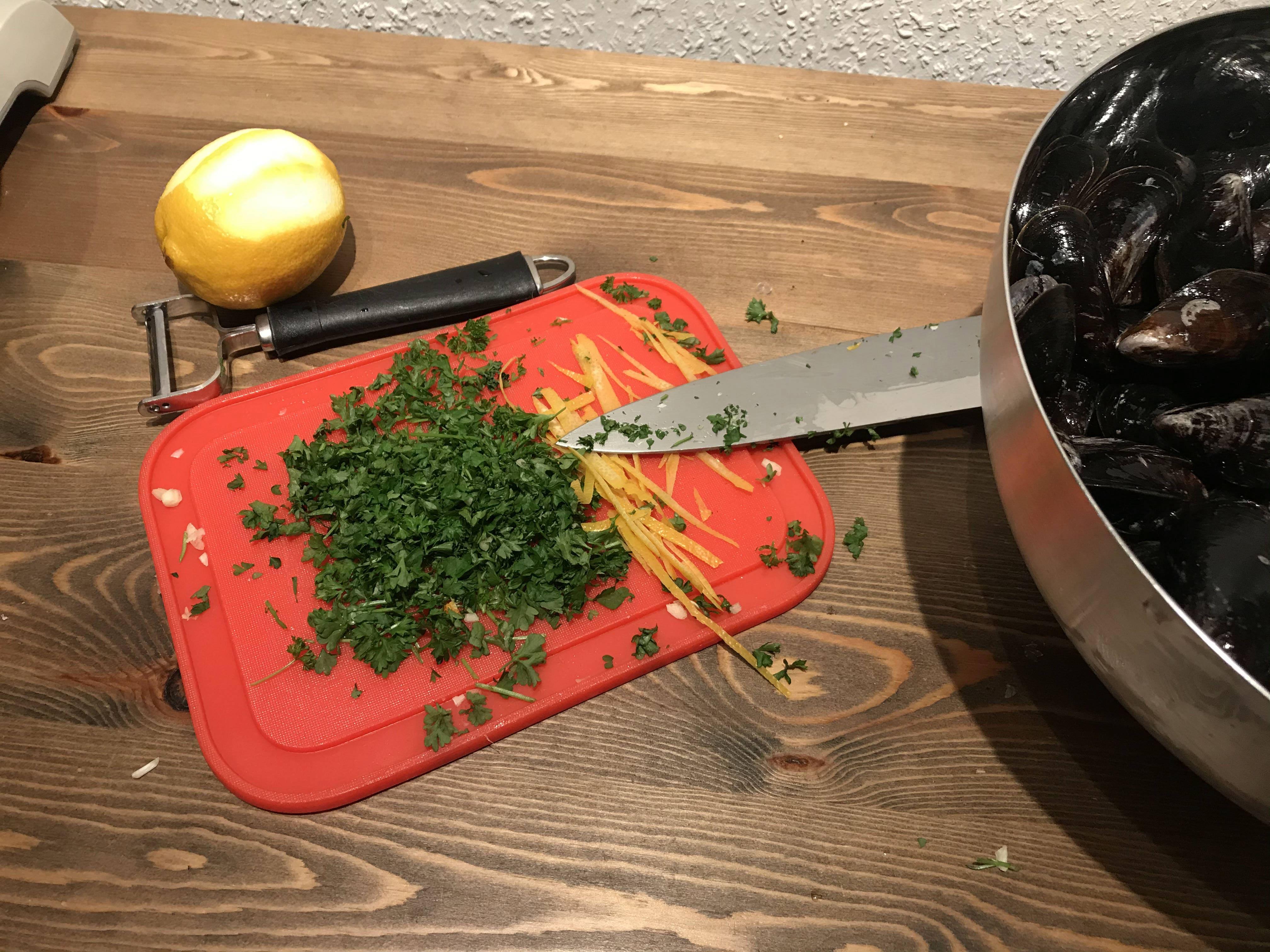 사진엔 이미 냄비에 넣어버려서 없지만 마늘을 다져주고 다진 파슬리와 레몬 제스트를 준비해준다. 마늘을 볶다가 버터를 한가득 넣어주고 레몬 제스트도 넣어준다. 마늘이 익을 때까지 기다린다음 화이트 와인을 넣고 좀 기다렸다가 홍합을 넣어주고 열렸을 때 꺼내면 된다.
