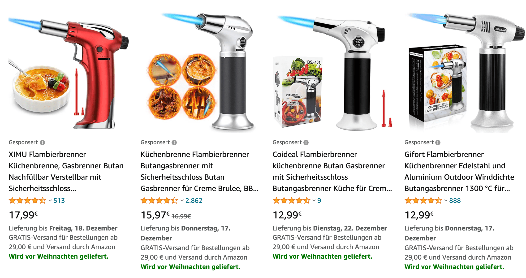 아마존에서 요리용 토치 Flambierbrenner, Küchenbrenner 등으로 검색 검색 👩🏻💻 내가 생각했던 토치는 가스에 연결해서 바로 쏘는 거였는데 토치를 검색하니 죄다 이렇게 생긴 것만 나왔다. 사진만 저렇게 해놓고 밑에 끼워다 쓰는 건가 했는데 그러기엔 몸통이 길고. 뭐지 하다가 좀 더 알아본 결과 가스를 저기에 리필해서 쓸 때는 가스통 연결 없이 쓰는 거였다.