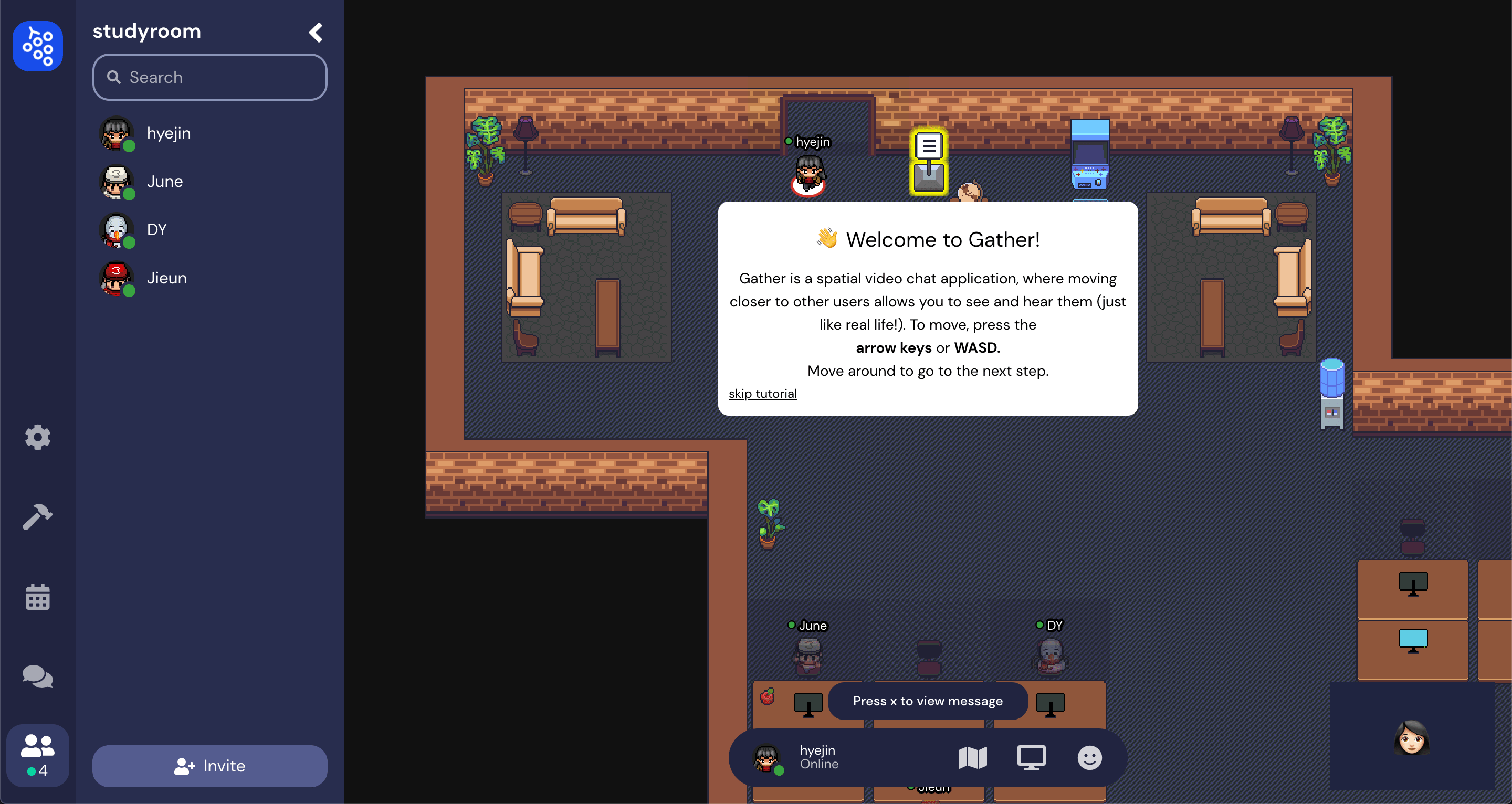 온라인에서 같이 포트폴리오 스터디를 구하는 걸 보고 이거다 싶어서 신청을 했는데 딱 인원도 적절히 6명 정도로 모였다. 온라인으로 같이 스터디를 해보는 건 처음이라 어떻게 하나 싶었는데 팀원 중 한 명이 좋은 프로그램이 있다며 Gather를 알려줬다. Gather는 온라인으로 이야기할 수 있다는 점에서 줌이랑 비슷한데 가상공간을 제공한다는 게 줌과는 다른 가장 큰 특징이다.